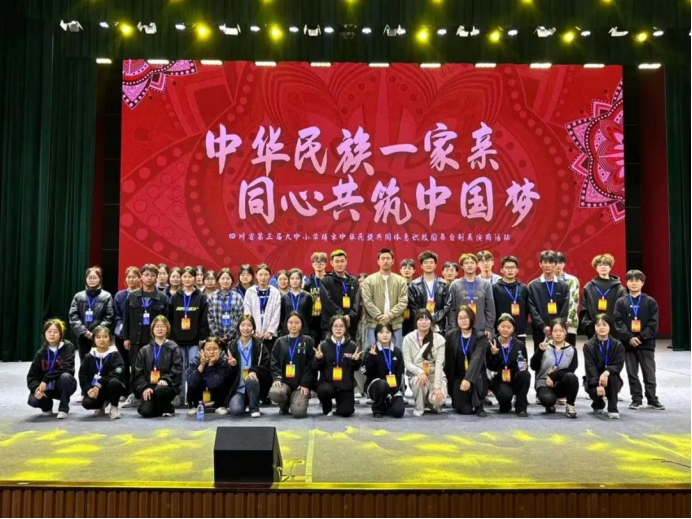 举办“中华民族一家亲·同心共筑中国梦”—四川省第三届大中小学铸牢中华民族共同体意识校园舞台剧展演等活动,同学们在舞台上散发光芒,工作人员在幕后认真工作。
