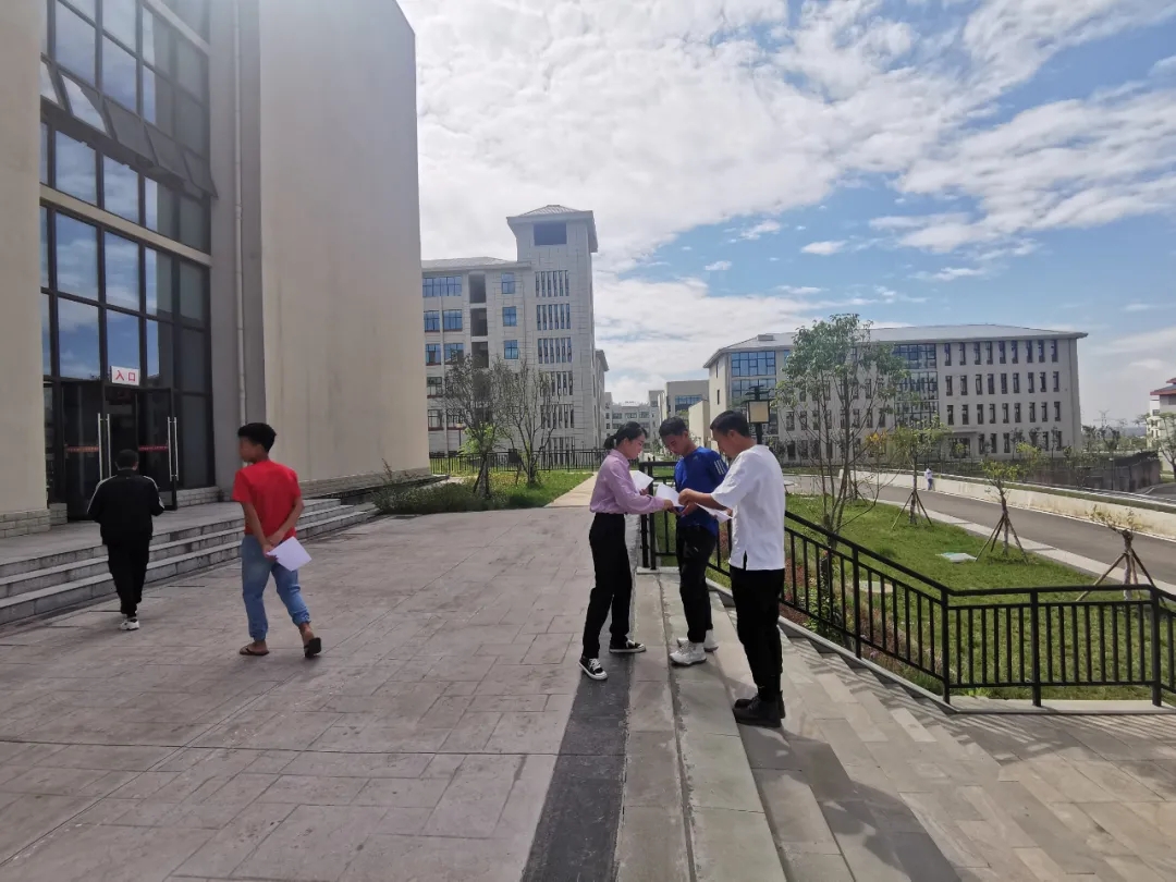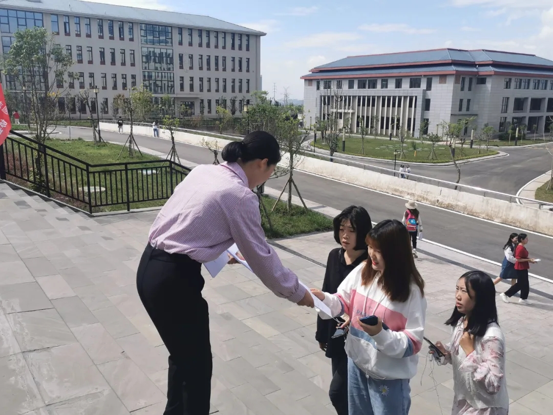 志愿者们正在食堂门口分发“勤俭节约”“光盘行动”宣传手卡