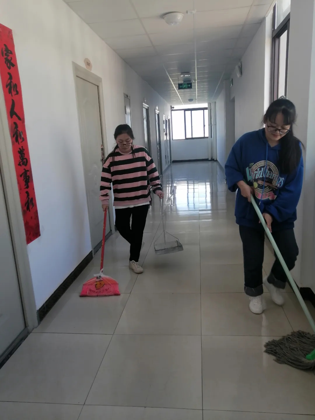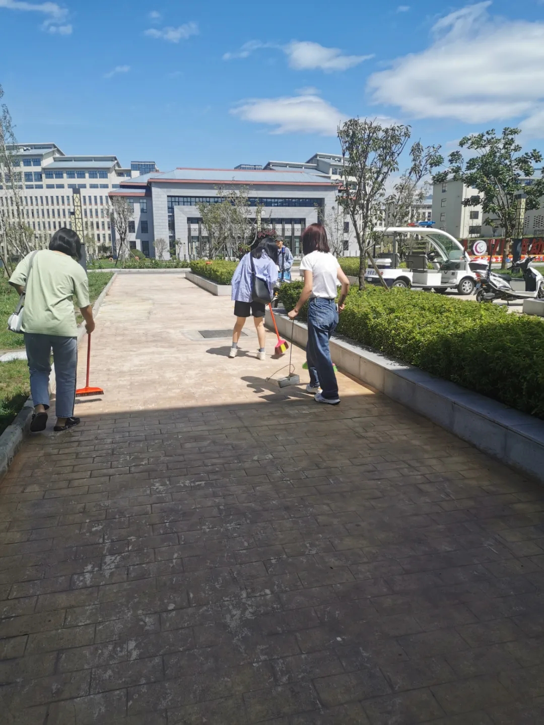 志愿者们正打扫校园公共区域