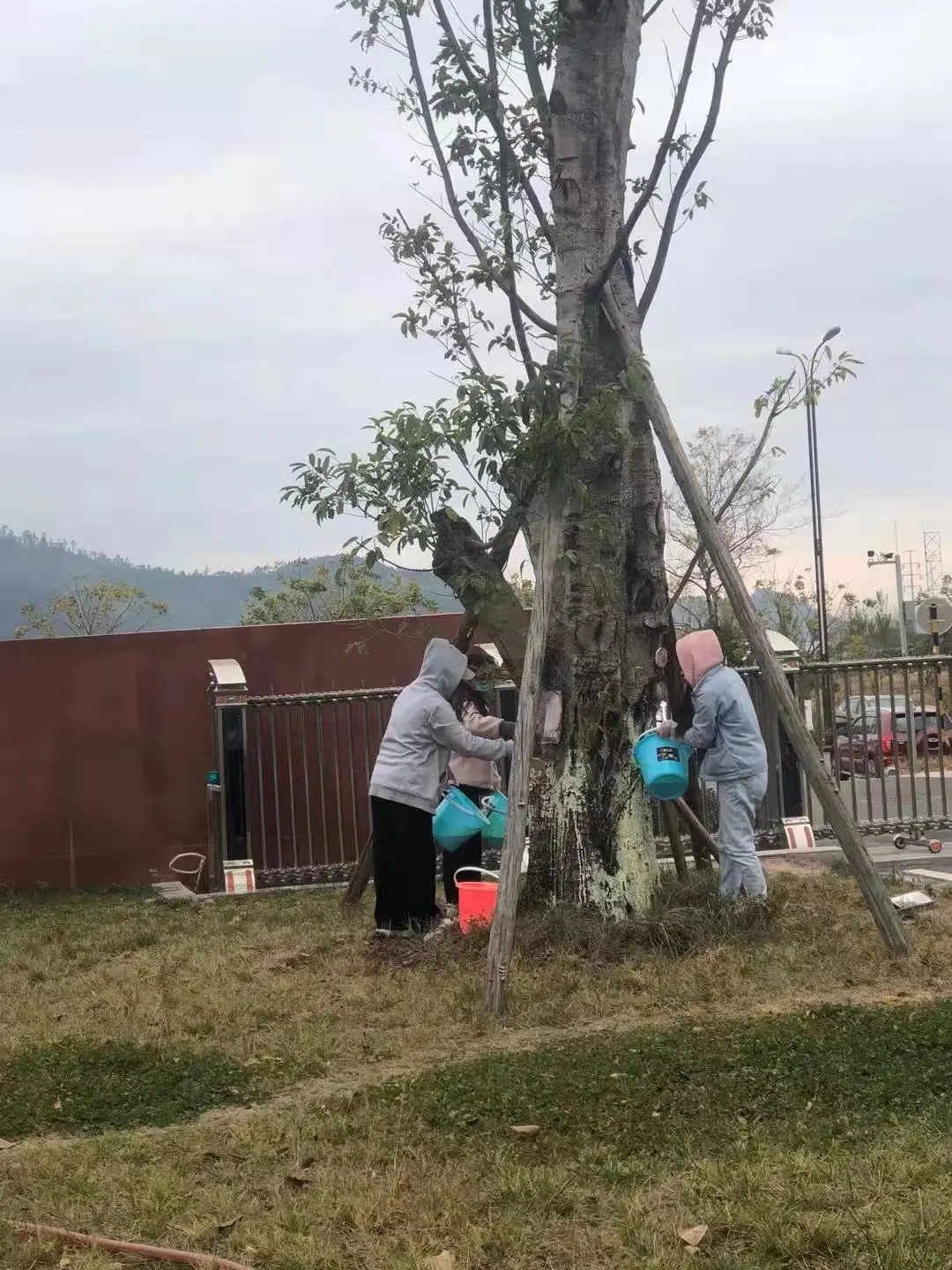 原来,这是为了消灭树皮内过冬的害虫及防止害虫上树产卵,还能为树儿防冻保温,保护树儿安全过冬,在来年春天为校园增添一份美丽,经过每一个青协成员的努力,西幼的每一棵树木将不怕严寒