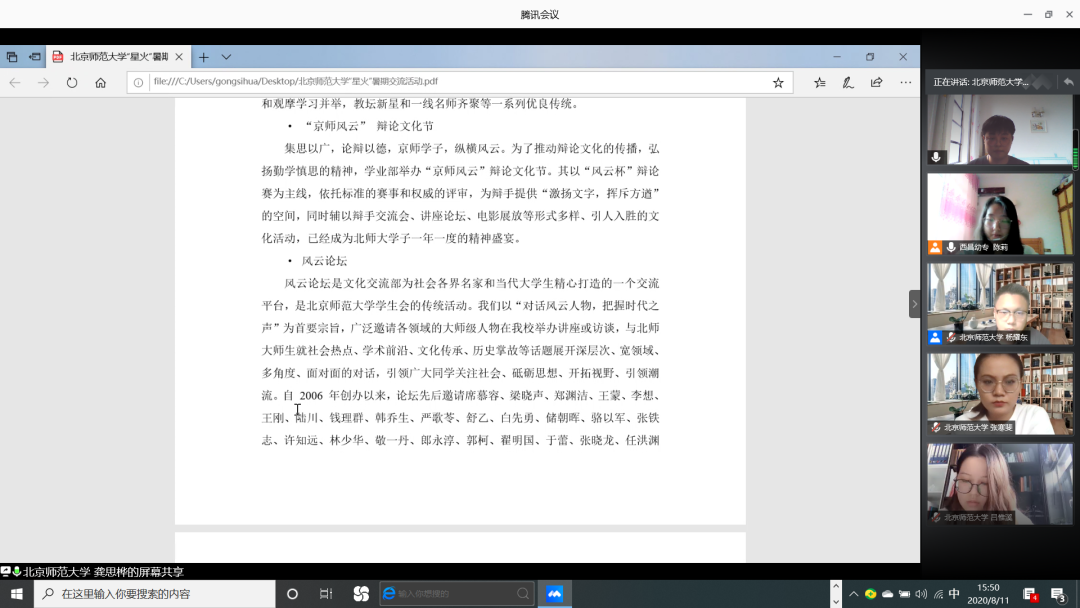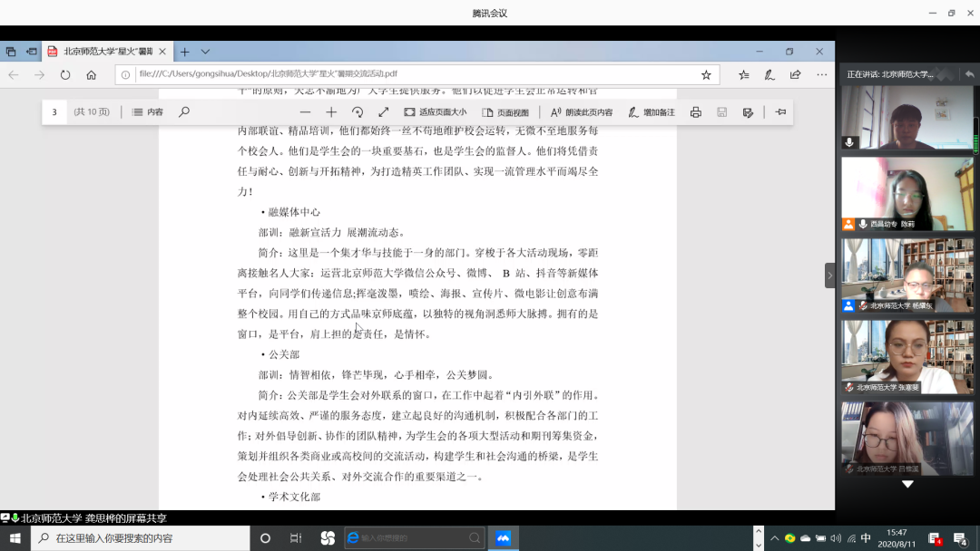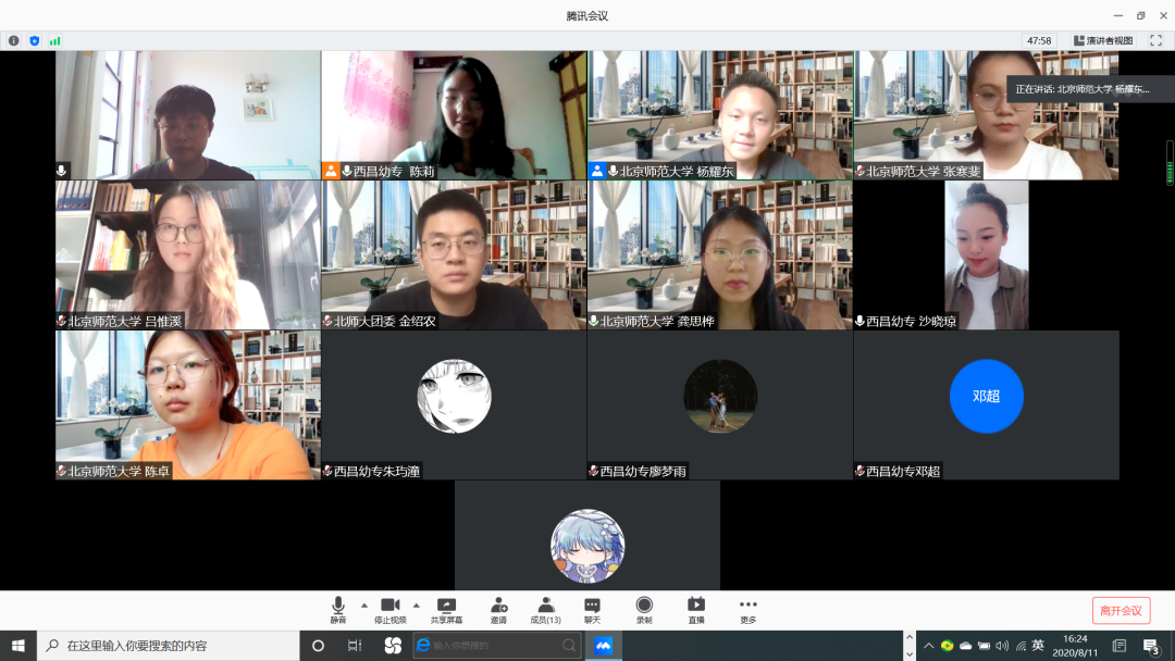 为提升我校团委校学生会的思想政治水平与为同学服务的能力,进一步加强学生会改革,促进团委学生会成长,借北京师范大学“星火”暑期交流活动为契机,我校团委学生会与北京师范大学团委学生会展开为期5—7天的线上交流活动。