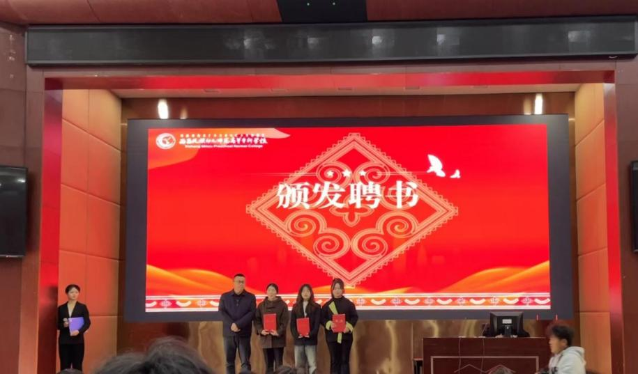一张轻薄的聘书,不仅是荣耀的徽章,更是一份沉重的责任与担当。它像是一支接力传递的古老火把,在时间的长河中,燃烧着永不熄灭的火焰,绽放出如同星辰般璀璨的光芒,照亮了通往知识殿堂与梦想彼岸的道路。由艺术教育系副主任胡云贵为上一届学生会学生干部代表颁发聘书,并合影留念。