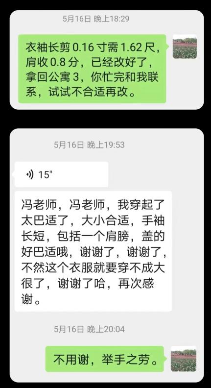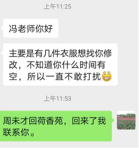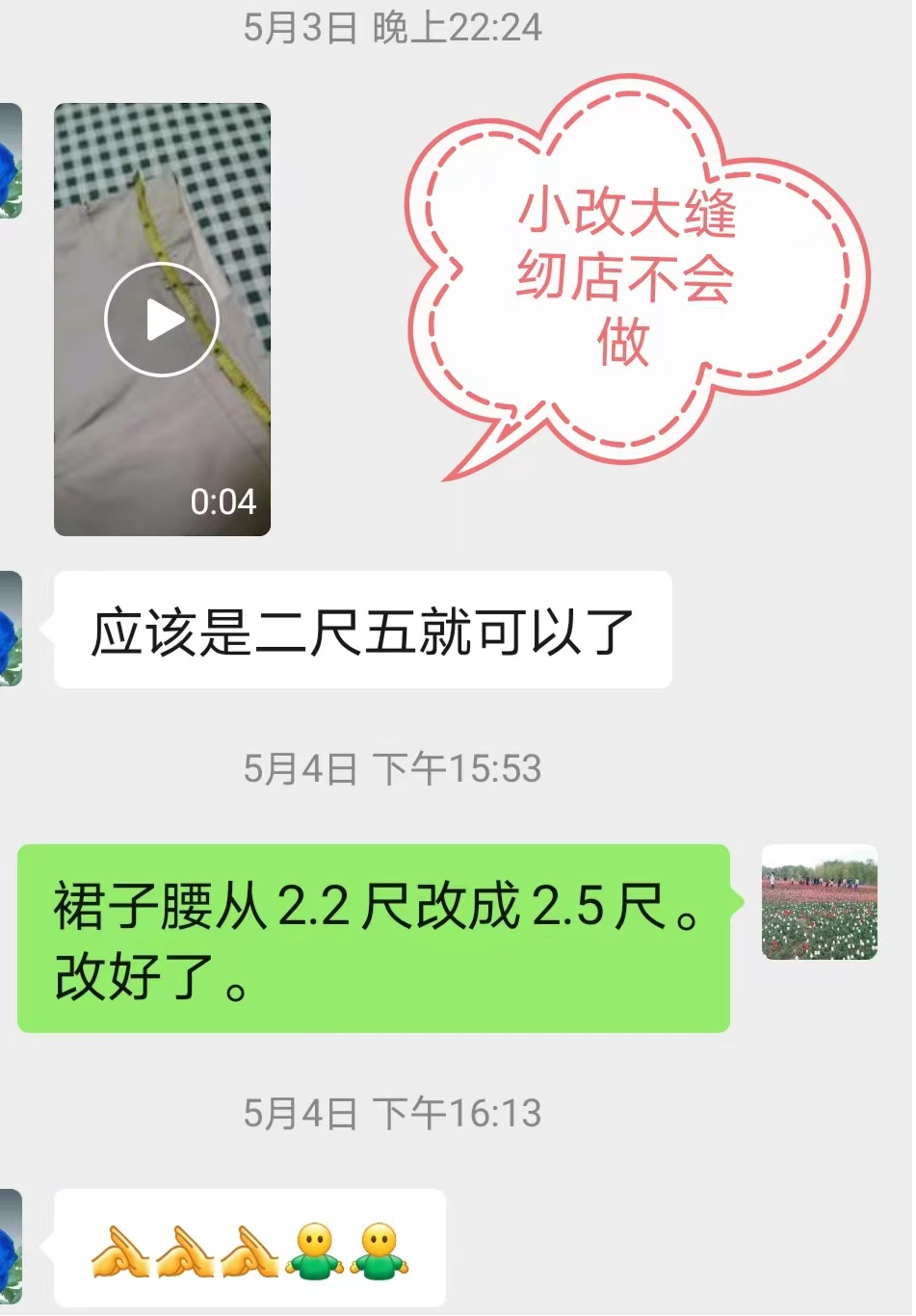 冯雁:遇到过很多的困难,其中改版时最为困难。比如,这条牛仔裤要求就挺高,裤脚需要裁剪去一部分后继续保留原底边,我试了2天才做好。这件衬衣是难度最大的,存在肩宽、袖长的问题,且面料薄、滑,需要将整件衣服拆开进行修改,过程中很担心将衣服改坏。这条牛仔裙腰大了3寸6,外面的裁缝店都不愿意进行修改,也是经过了多次的修改才达到比较完美的效果。