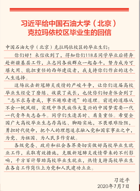 7月7日,习近平总书记给中国石油大学(北京)克拉玛依校区毕业生回信,肯定他们到边疆基层工作的选择,对广大高校毕业生提出殷切期望。在这封专为2020届高校毕业生所写的回信中,习近平总书记勉励广大青年学子志存高远、脚踏实地,不畏艰难险阻,勇担时代使命,把个人的理想追求融入党和国家事业之中,为党、为祖国、为人民多作贡献。回信温暖亲切、催人奋进,在广大青年学子尤其是高校应届毕业生中引发热烈反响。