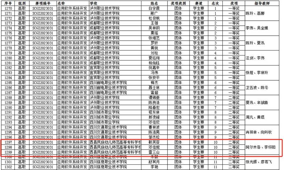 在2023 年“中银杯”四川省职业院校技能大赛(高职组)应用软件系统开发赛项中,我校信息技术系(信息中心)遴选出3支队伍参赛,与来自全省的59支代表队同场竞技。在校领导的关心和各部门的大力支持下,经积极备赛、努力拼搏,由学生靳芙蓉、邓佳妮、雷三山组成的竞赛团队荣获省二等奖(指导教师阿尔木各,李怀阳),何采霖、郑长鑫、刘帅组成的竞赛团队荣获省三等奖(指导教师陈芳霞、阿尔木各),为学校争得荣誉。