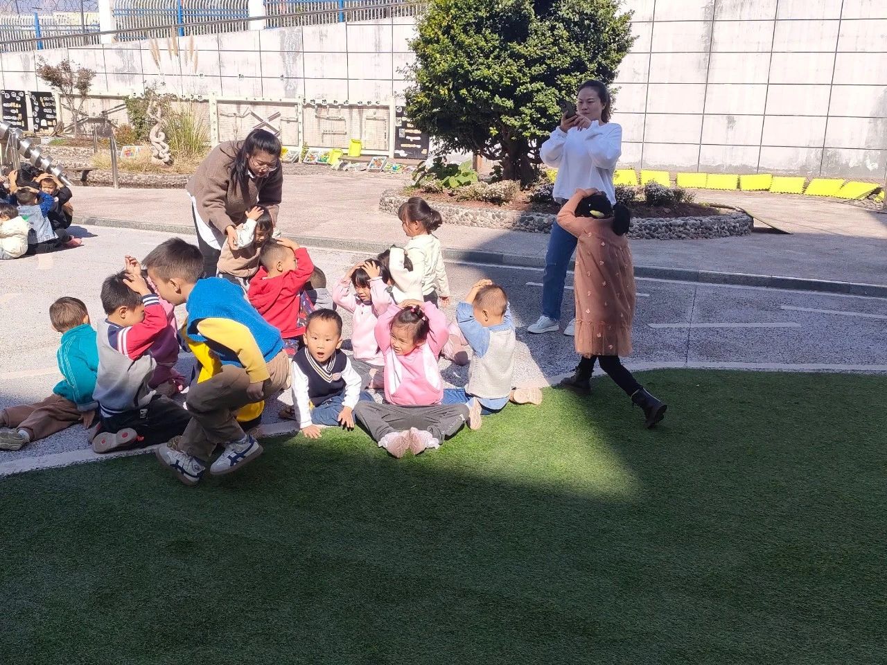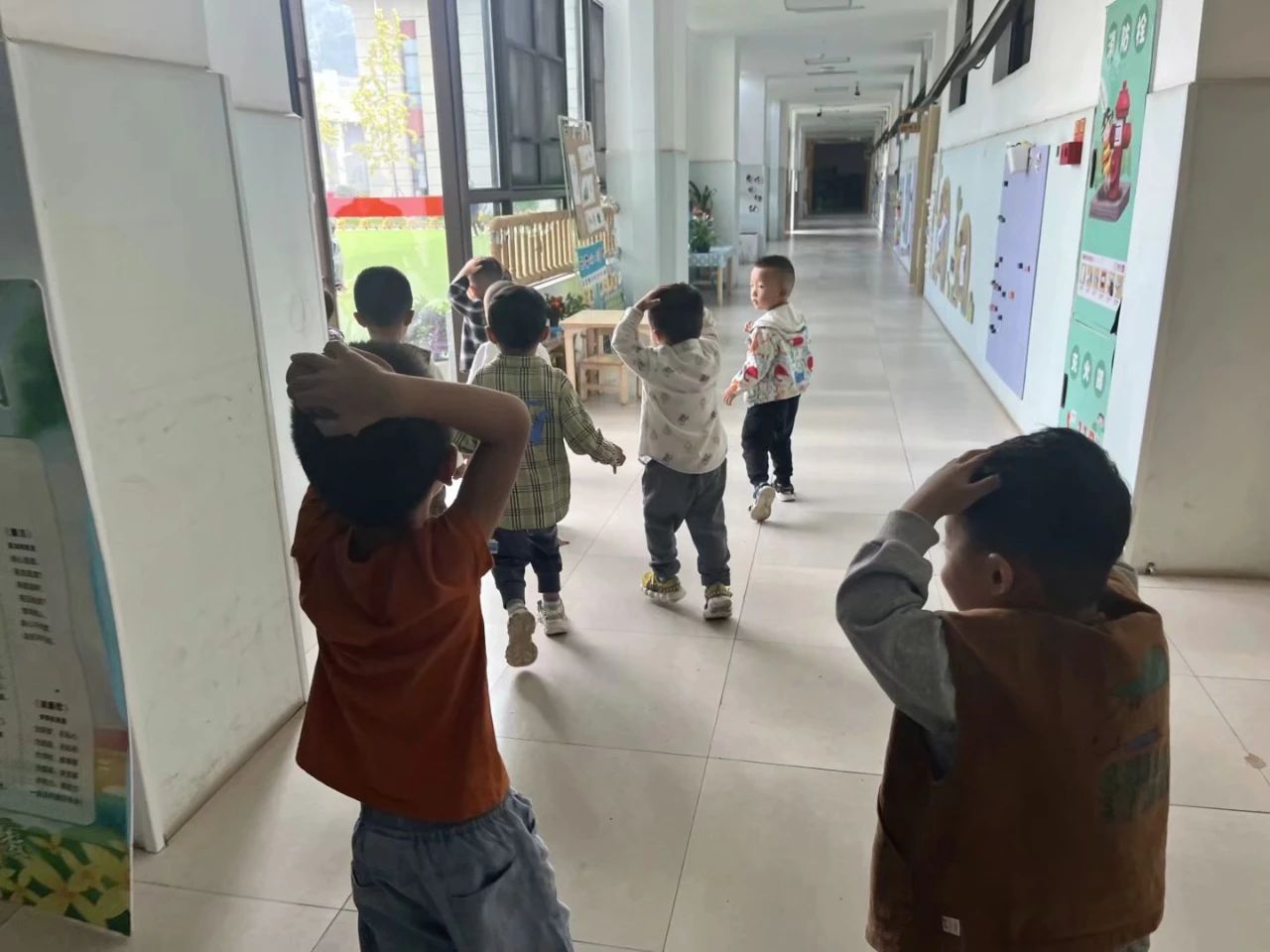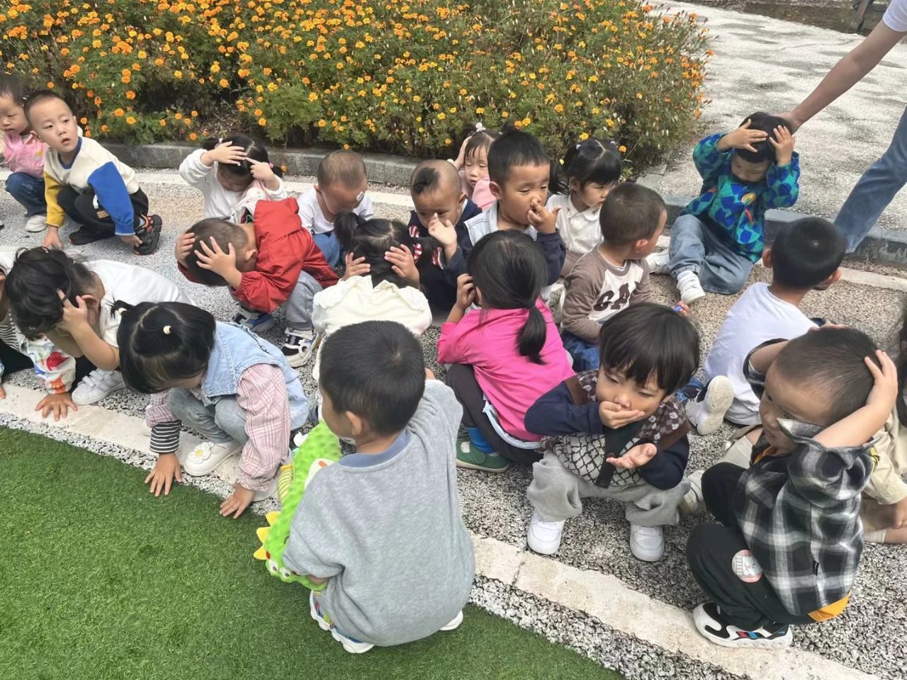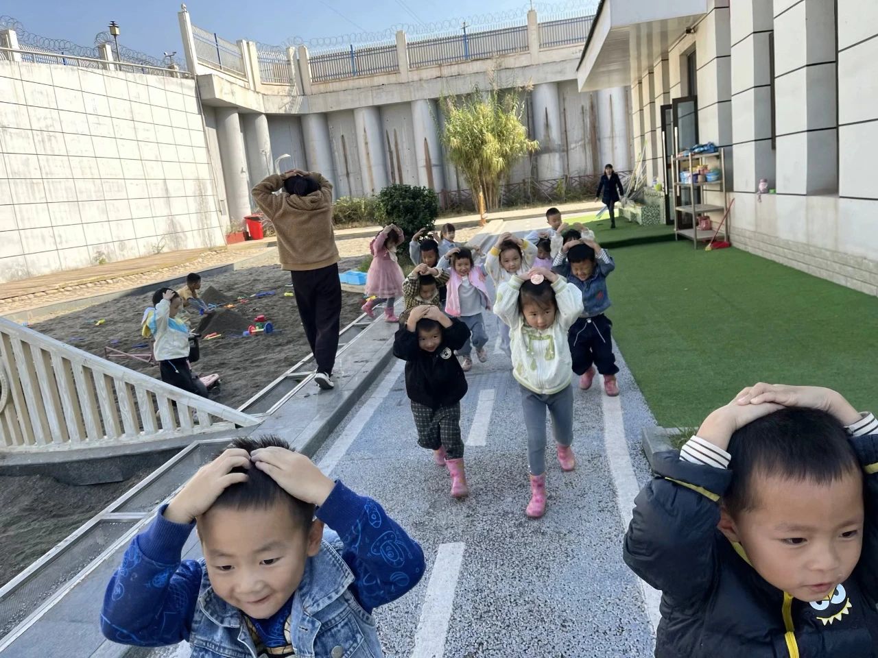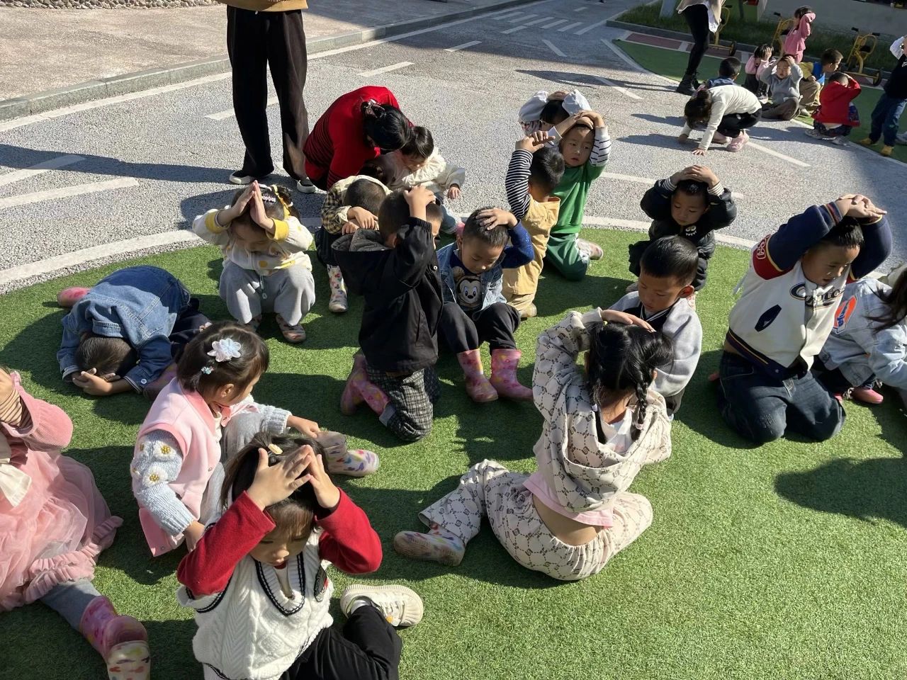 孩子们在老师的指挥和带领下用最快的速度,顺着预定的疏散逃生路线有序的撤离到操场空旷地蹲下。