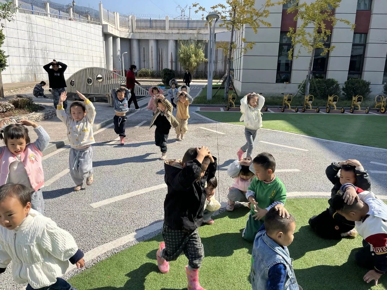 随着第一声警报响起,防震应急疏散演练正式开始,老师立即组织幼儿停止活动,以最快速度引导幼儿双手护头、降低重心,进行紧急避险。
