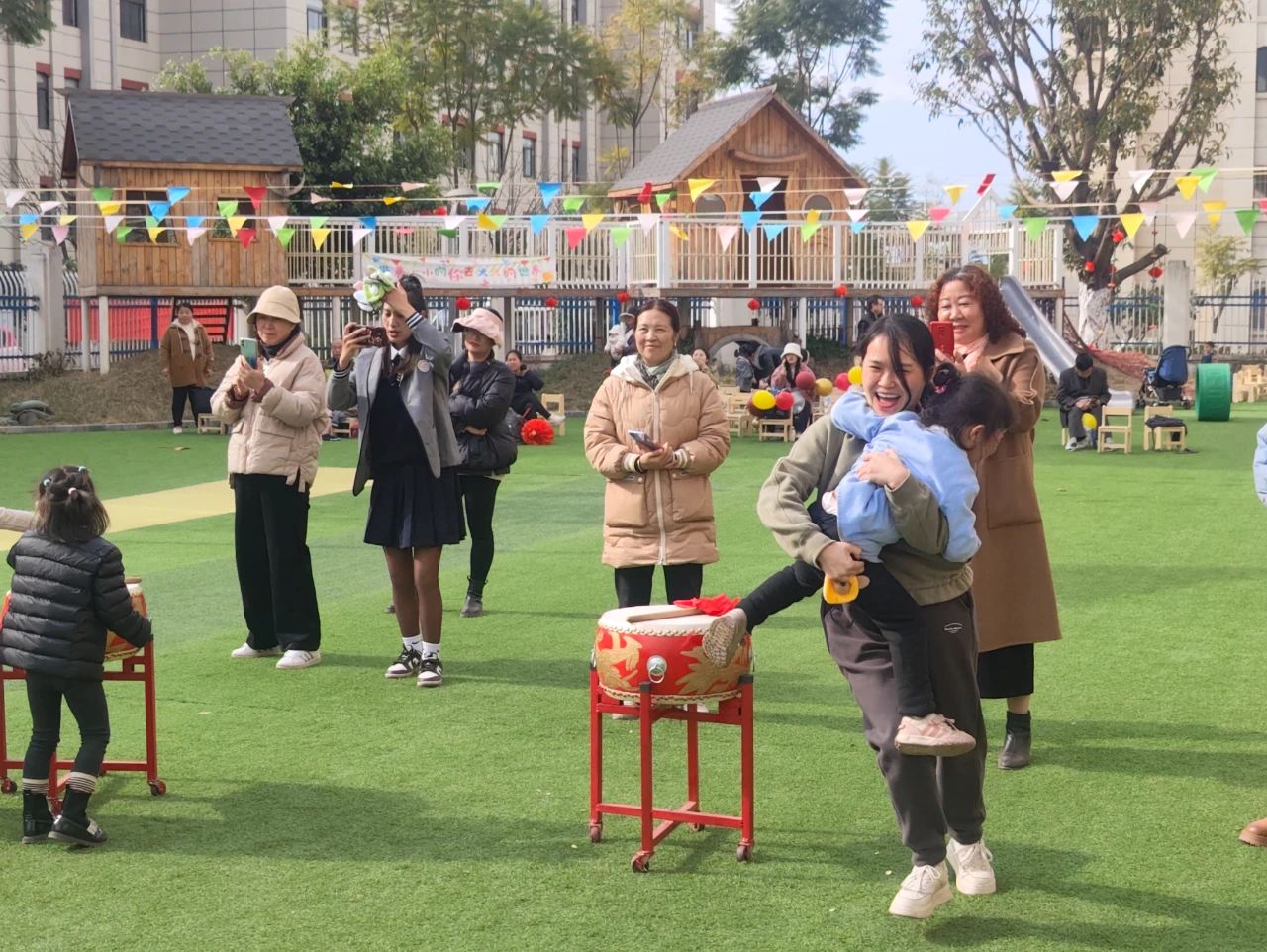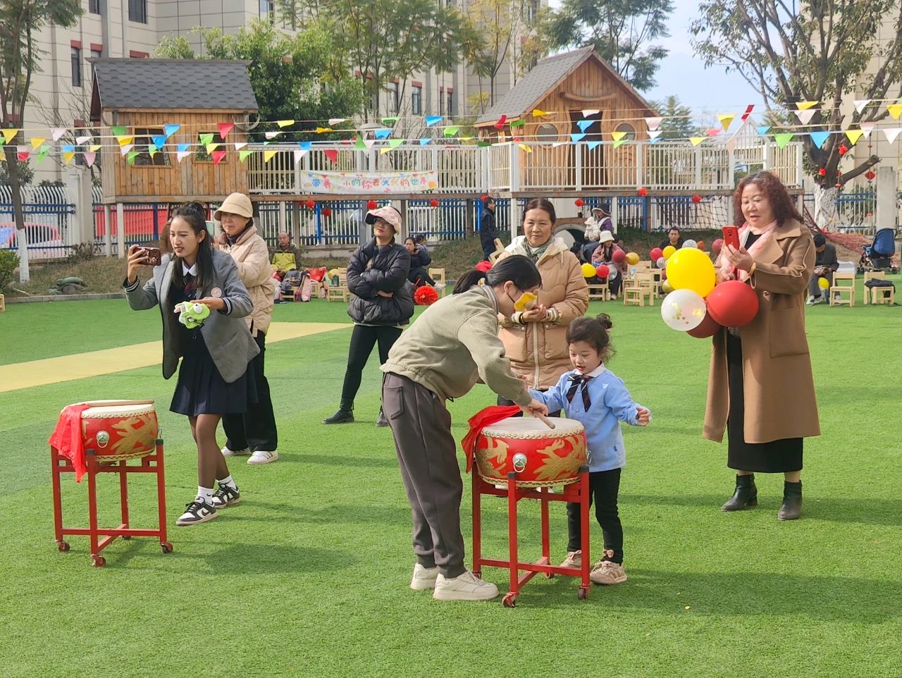 我们担心蒙着眼睛的爸爸妈妈碰到障碍物会摔倒,便紧紧地拉着他们躲过障碍物,走到大鼓前,用鼓棒敲出响亮的鼓声,默契配合的我们快速地来到了终点。