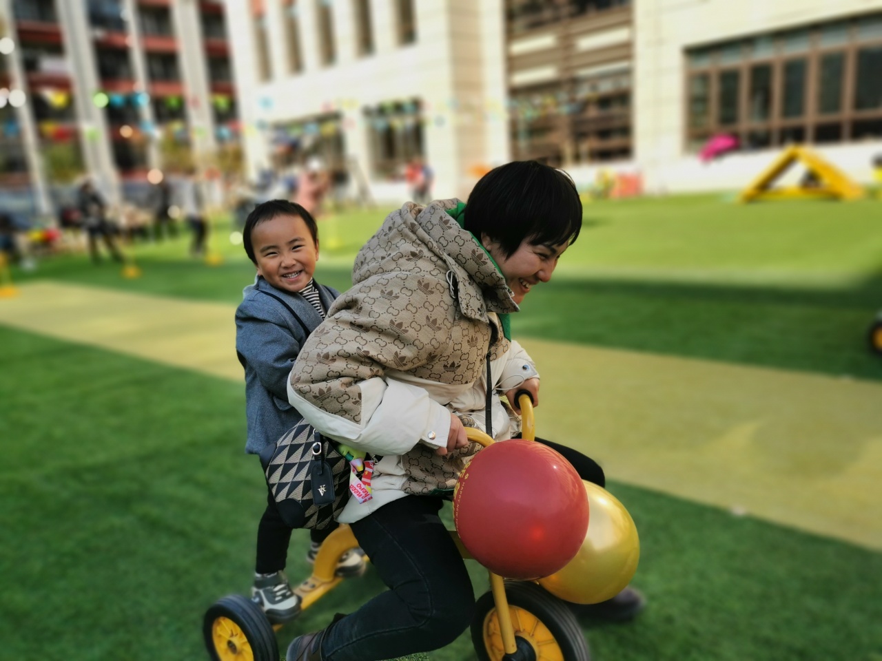 爸爸妈妈骑着三轮车拉着我们,绕过障碍物,我们脚踩稳,手抓牢,不管骑得有多快,我们都没有甩下来,我们很默契吧......