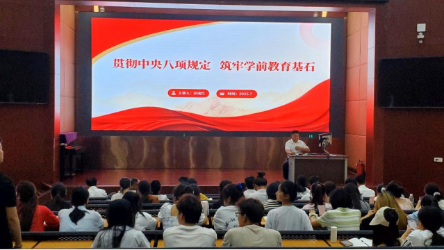 余成红书记讲到,2012年12月4日,中央政治局审议通过改进工作作风、密切联系群众的八项规定,涵盖调研、会议、接待等八项具体要求,彰显从严治党决心。此后,中央以钉钉子精神落实规定,持续整治 “四风”,规范公务活动,推动党风政风焕然一新,使其成为党员干部的行为准则。中央八项规定精神核心是保持党同人民血肉联系,践行以人民为中心思想,要求干部摒弃形式主义,厉行节约。在新时代,它是从严治党的有力抓手,对学前教育系而言,能助力聚焦教学,提升人才培养质量,培育良好师德师风 。