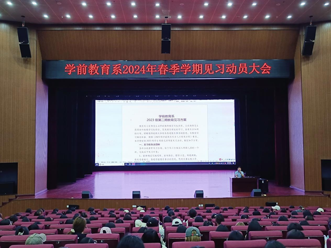 4月29日在雏鹰剧院开展见习动员大会。会上,学前教育系主任余成红、副主任魏衍辉、胡红分别对见习目的、见习要求和见习任务进行明确和解读;并对即将前往幼儿园开展见习的同学们送上鼓励和祝福。根据学前教育专业人才培养方案,2022级此次的见习任务主要聚焦集体教学活动的观摩与实践,2023级的见习任务则主要聚焦在了解和观摩幼儿园一日常规生活。