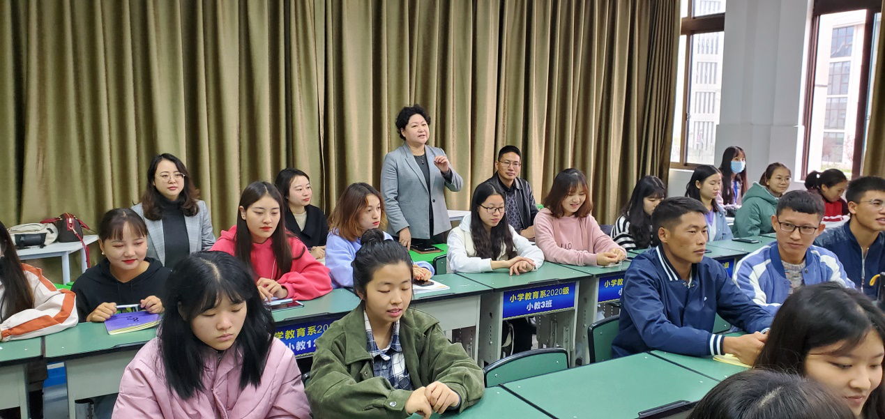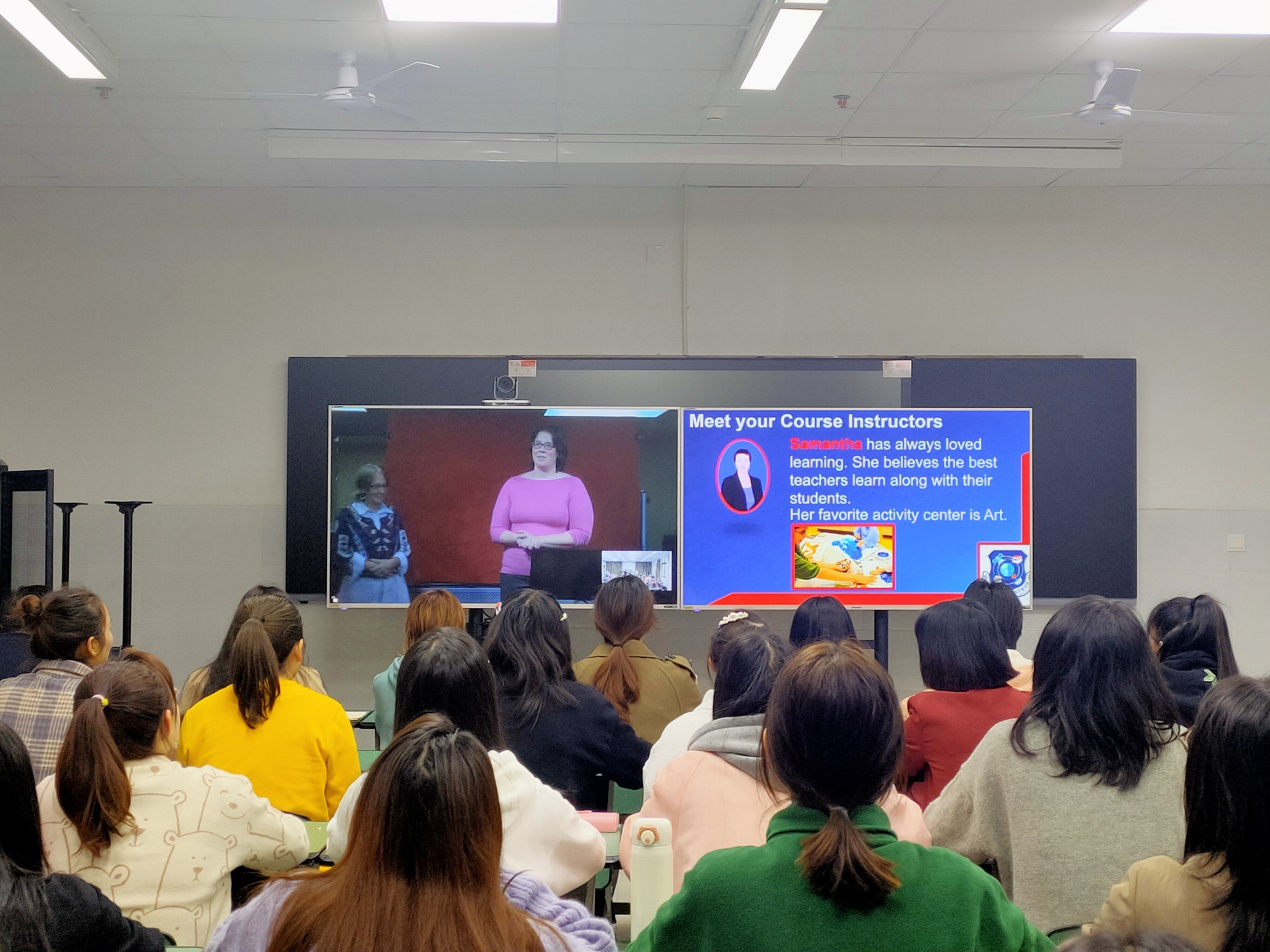 为进一步提升我校学前教育系学生的综合素质,充分落实人才培养方案,为学前教育事业储备多元化人才,2020年10月23日上午8:10,在北京王府学校的帮助下,一堂别开生面的课程在学校1304教室拉开帷幕——来自美国北卡的外教老师们通过卫星直播,对学前教育系的50位同学进行了职前幼儿教师英语课程授课。