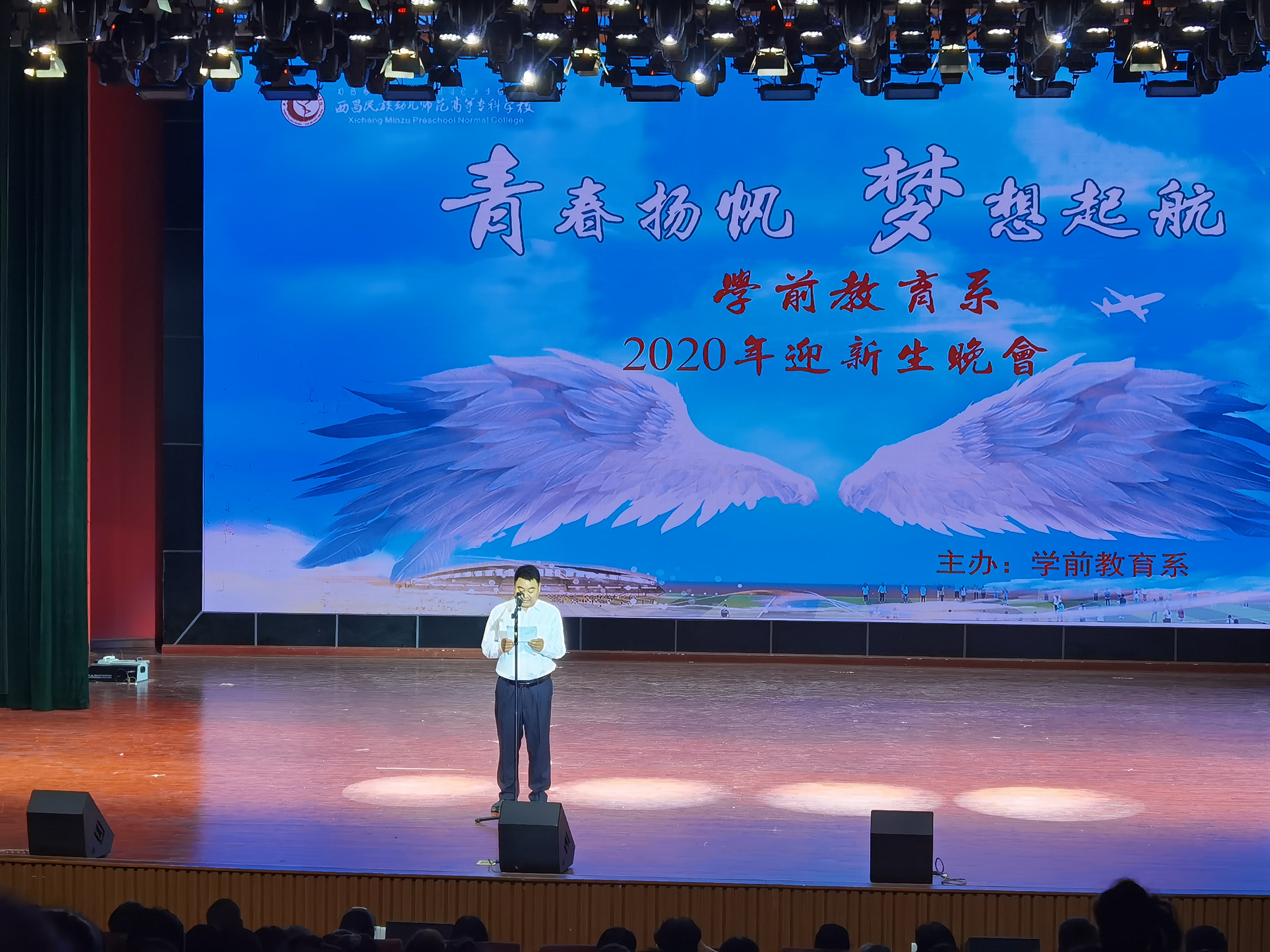 晚会伊始,由学前教育系主任余成红主任致辞。余主任在讲话中再次表达了对2020级新生的热烈欢迎,为他们即将正式起航的大学学习和生活送上希冀与建议:做开卷有益的学习者,做脚踏实地的学前人。最后,余主任强调此次迎新晚会是校园文明建设和推进系部发展进程中的重要一环,并预祝此次晚会圆满成功。