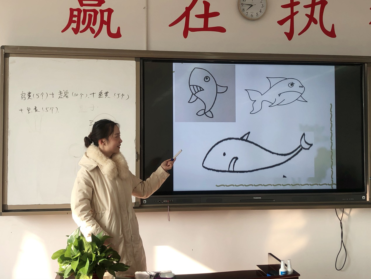 丁雪芮老师正在教室内为同学讲解面试中面对绘画题型时应该如何应对。丁老师的讲解过程气氛活跃,在教会同学们简笔画创作技巧的同时,还点出如何将绘画元素于幼儿园教学活动巧妙融合。