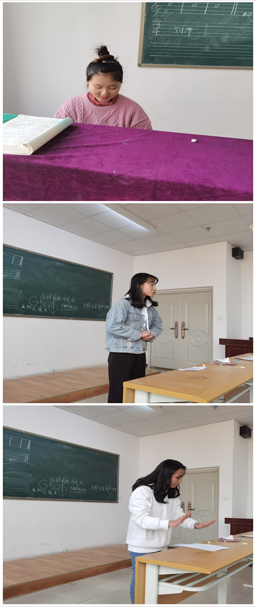 即将参加教师资格证面试的同学们利用课余时间抓紧对弹唱、讲故事和游戏等内容的练习。走在校园中,无论白天黑夜,总能在不经意间听见空着的教室里传出正在试讲的声音。