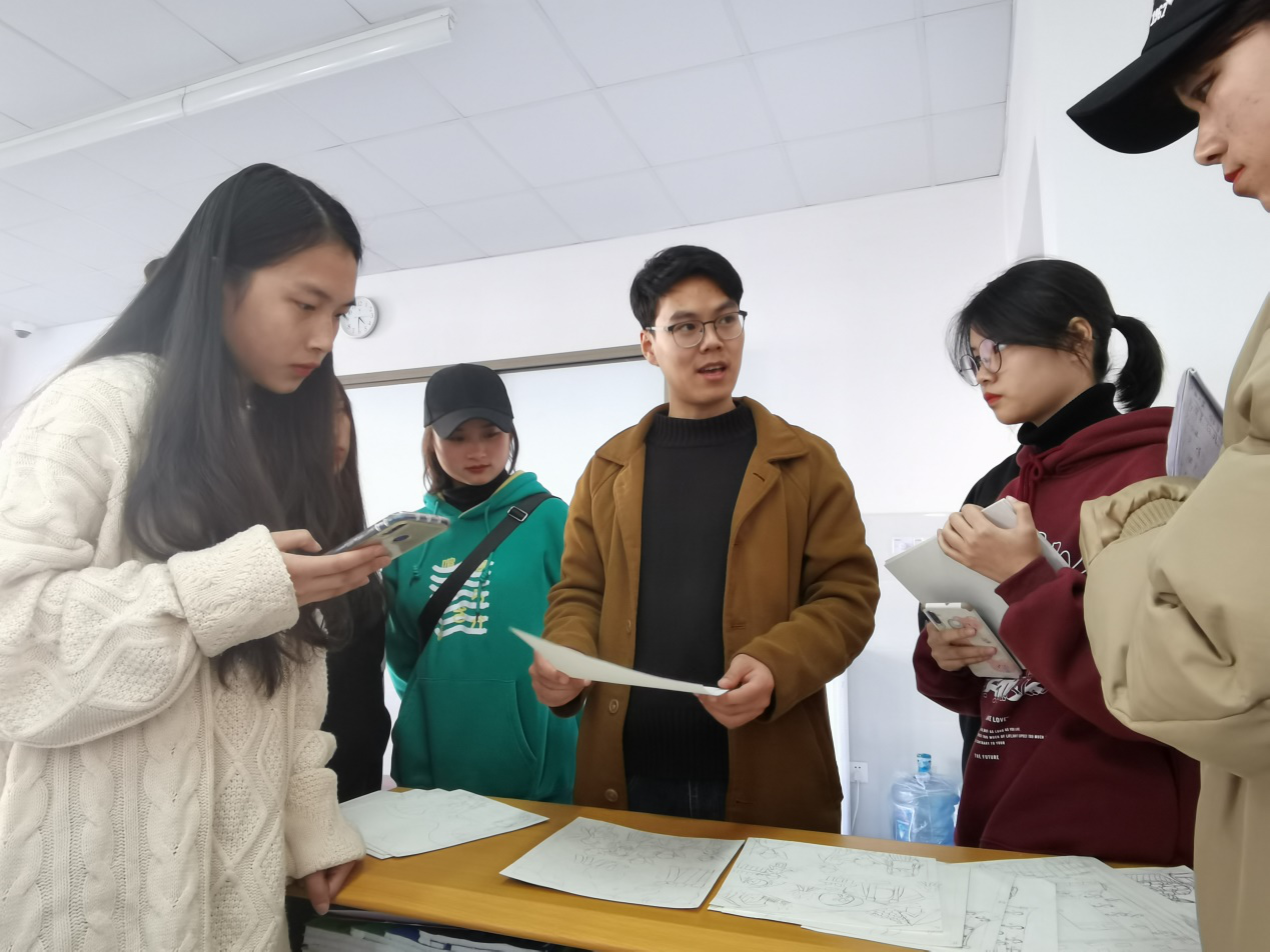 林强老师在对同学们进行讲故事和儿歌内容的培训。林老师从审题立意到活动方案设计,再到如何试讲,都一一为同学们排忧解难,一直忙碌到深夜,直到大家都豁然开朗后,方才关灯离去。