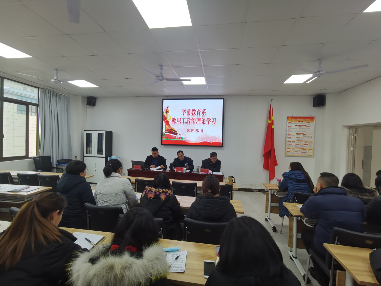 为贯彻落实学校关于2021年1月教职工政治理论学习的工作安排,进一步提升教职工政治思想素质和政策理论水平,切实增强推动学校改革发展的思想自觉和行动自觉,2021年1月21日下午2:30,学前教育系于学校第四教学楼4308办公室举行了教职工政治理论学习会。学校党委委员、副校长马辉莅临学习会现场,会议由学前教育系党支部书记魏衍辉主持,学前教育系全体教职工参会。
