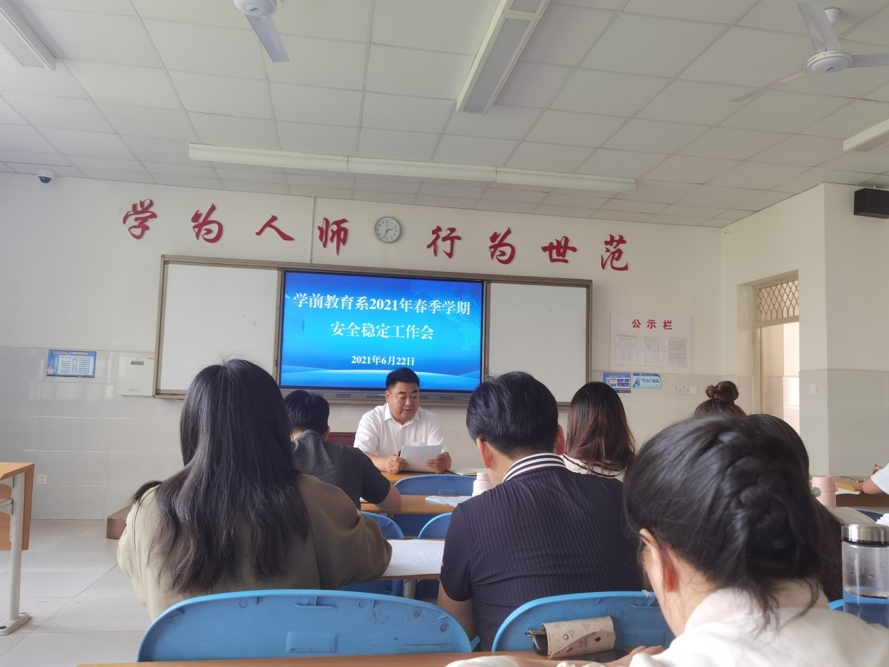 为进一步落实学校关于2021年安全稳定工作会议的相关精神,确保本学期期末各项工作在有安全保障的前提下顺利开展,学前教育系在学校召开安全工作大会后,于2021年6月22日下午2:30在第四教学楼4113教师迅速组织召开2021年春季学期安全稳定工作会。学前教育系全体教职工参会,会议由学前教育系主任余成红主持。