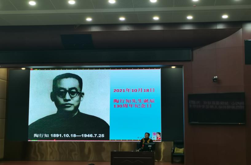 问题和思考过后,台下同学记住了一个伟大的名字——陶行知。他是伟大的人民教育家、教育思想家、社会学家、著名的民主革命家、伟大的爱国者、大众诗人陶行知。10月18日是陶行知先生诞辰130周年纪念日,陶行知先生学贯中西,一生致力于中国教育事业改造,探索中国自己的教育之路。彭老师在讲座中以陶行知先生的“两个变”为切入点,引导同学们进行思考,提出作为学前教育者,要从专业的健康、语言、社会、科学和艺术五大领域着手,从不同的角度促进幼儿的可持续发展。