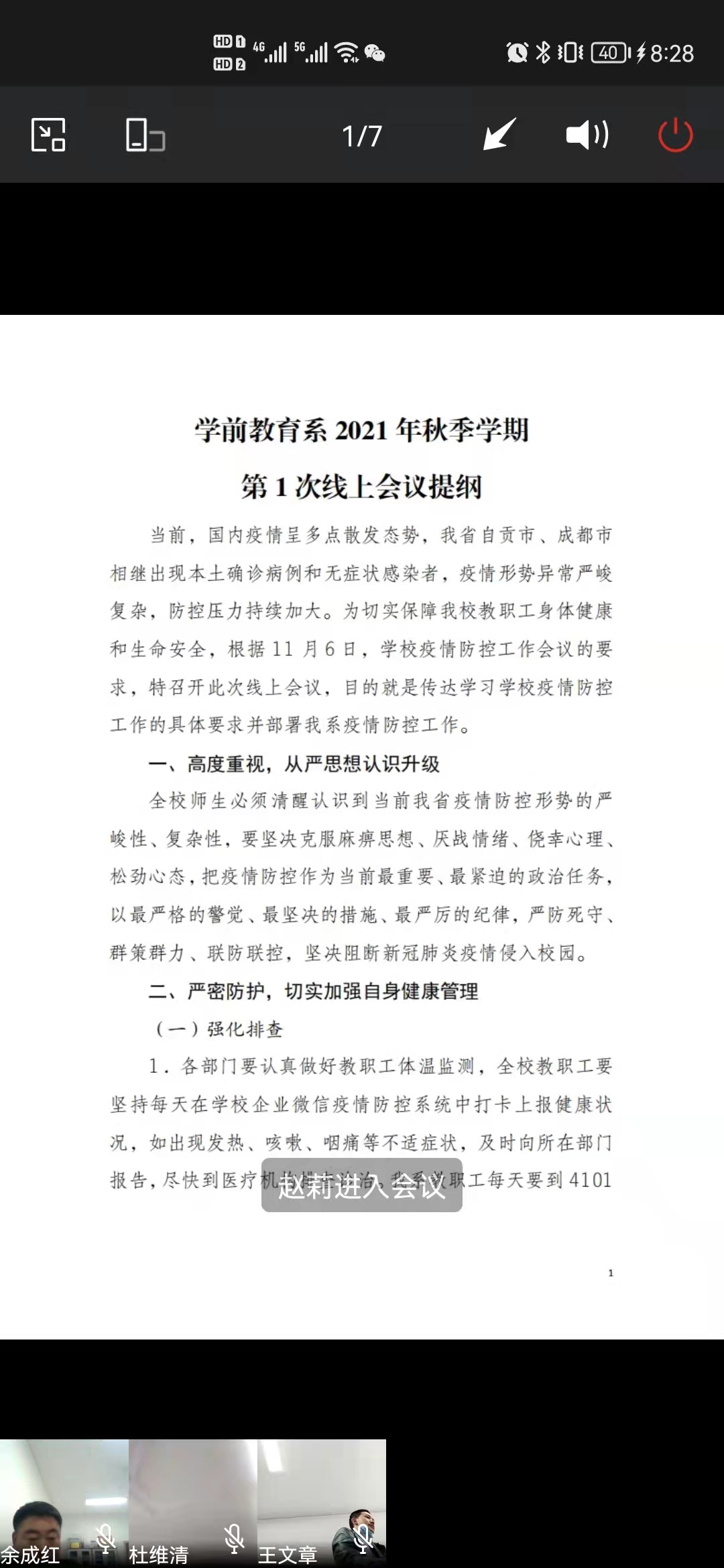 晚上8:30,我系继续召线上新冠肺炎疫情防控工作部署会议。会议在学前教育系主任余成红的组织下有序开展,学前教育系全体教职工参会。会上,余主任再次针对上级部门及学校出台的疫情防控期间相关文件精神和要求进行传达,明确每一位教职工在疫情防控期间应有的职责与担当。余主任详细解读了《凉山州应对新冠疫情应急指挥公告(第5号)》《四川省教育系统疫情防控工作领导小组关于进一步做好当前疫情防控工作的紧急通知》《西昌民族幼专疫情防控工作领导小组学生组疫情防控工作方案》等文件,要求全体教职工24小时在校,严格履行疫情期间学校的相关纪律要求,并于会后立即完善了教师每日体温打卡等工作程序。余主任还提出要做好课堂防疫工作,任课教师正常行课的前提下,要做好线上授课预案,随时应对突发情况。