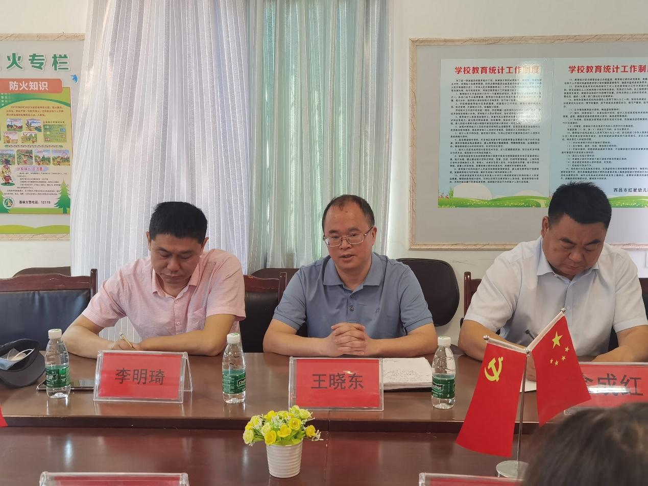 王晓东副校长一行首先到西昌市红星幼儿园总园调研,参观了园所环境,详细了解园所教育活动开展和学生实习情况。随后在红星幼儿园教研办公室召开了西昌民族幼专2022实习生汇报暨教育实践基地园教学研讨座谈会。