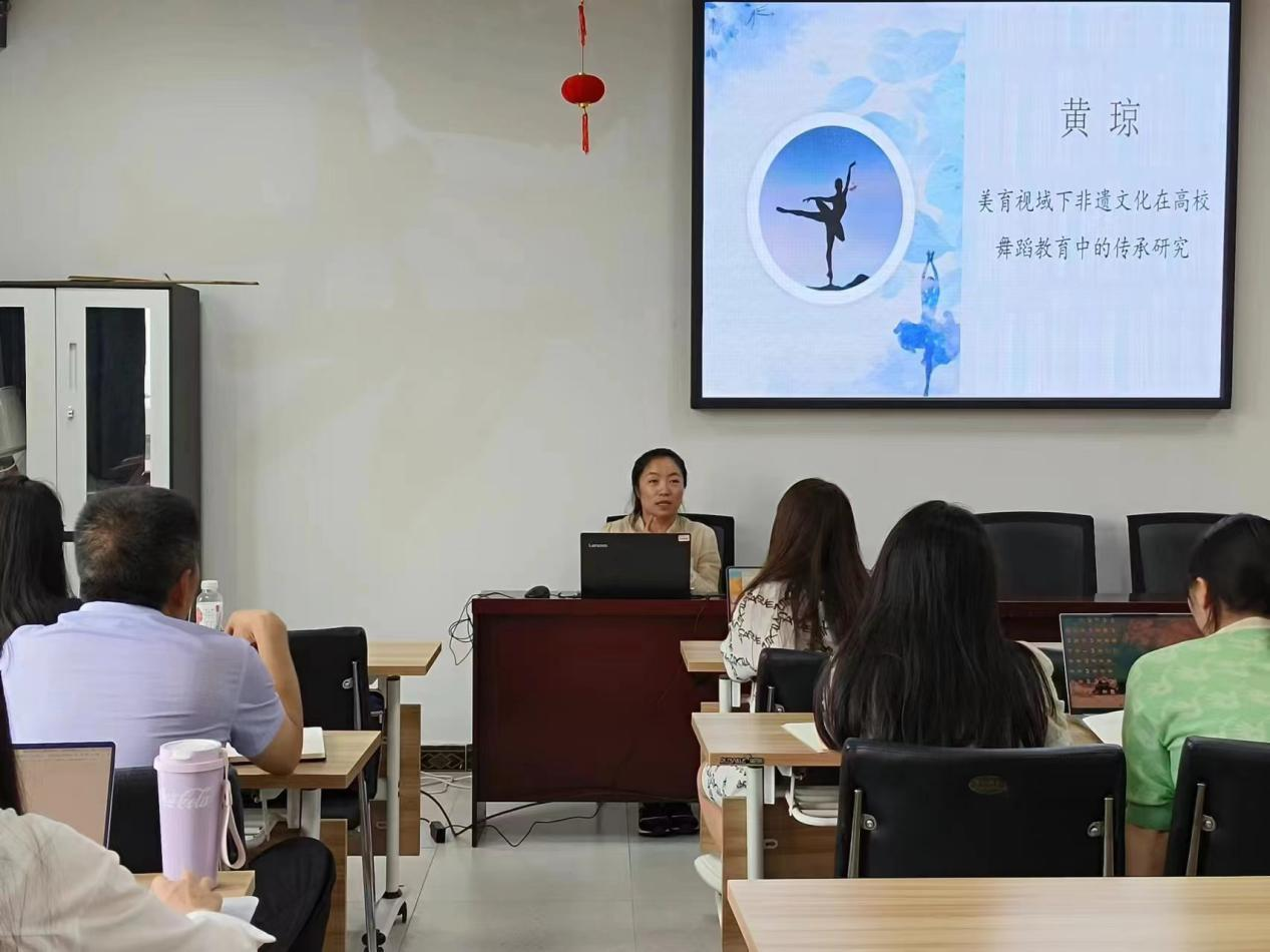 科研课题分享环节,工作室成员黄琼老师重点对《美育视域下非遗文化在高校舞蹈教育中的传承研究》进行分享。提到在教育教学过程中要合理运用传统文化,加强对非遗元素的开发,让非遗元素与幼儿舞蹈相融合,碰撞出新的火花,在幼儿舞蹈教学中进行更好的呈现。