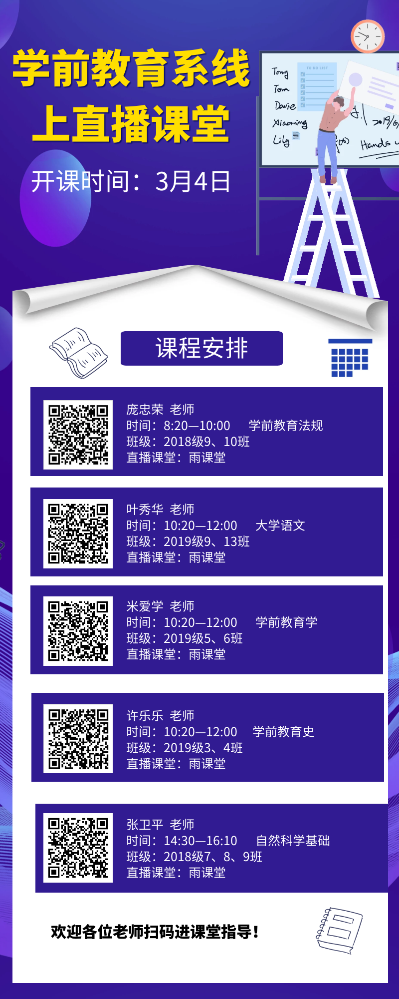 (三)提前一天公布授课信息,由学校教学督导组对在线教学进行随机听课及查课。第一周,我系每天公布 5 位教师的授课信息,达到了所有任课教师线上教学督导全覆盖。