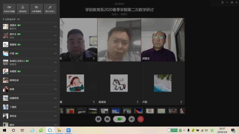 3 月 6 日,我系就第一周的线上教学召开了一次专门的线上研讨会。就线上教学工作租了总结性梳理,各教研室负责人进行了一些收集意见的反馈和线上教学经 验意见收获的交流。及时研讨交流为后续教学工作的扎实推进奠定了基础。