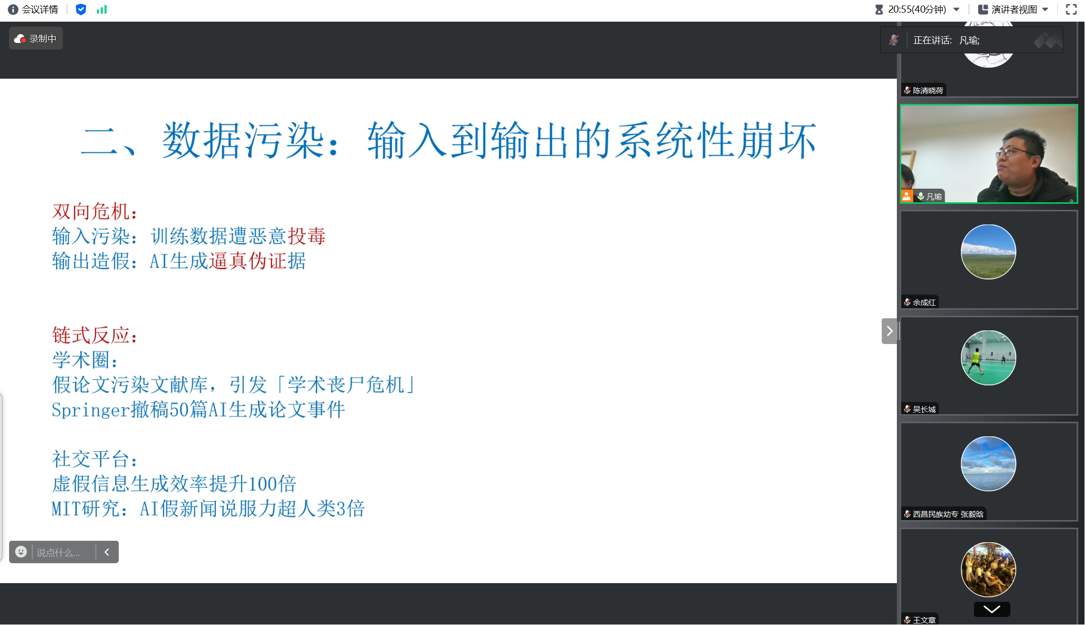 李攀老师深入剖析了 AI 在知识生产过程中可能引发的问题。他首先指出“AI 幻觉”现象,即 AI 生成的内容看似合理,实则可能缺乏深度与准确性,这种幻想容易误导知识的接受者。其次,他强调了“数据污染”的严重性,数据从输入到输出的每一个环节都可能存在问题,导致知识生产的系统性崩坏。最后,李攀老师探讨了“知识革命”带来的后现代认知危机,AI 的快速发展使得传统的知识体系与认知方式受到冲击,教育者需要重新审视知识的本质与传播方式。