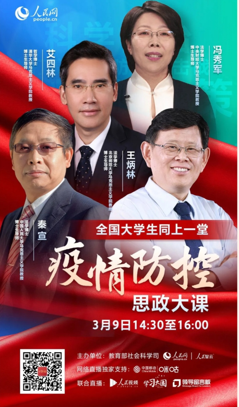 今日,在举国上下万众一心、众志成城做好新冠肺炎疫情防控工作的特殊时刻,为将高校思想政治理论课教学优势转化为支持防疫斗争的强大力量,教育部社科司与人民网将联合组织开展全国大学生同上一堂疫情防控思政大课