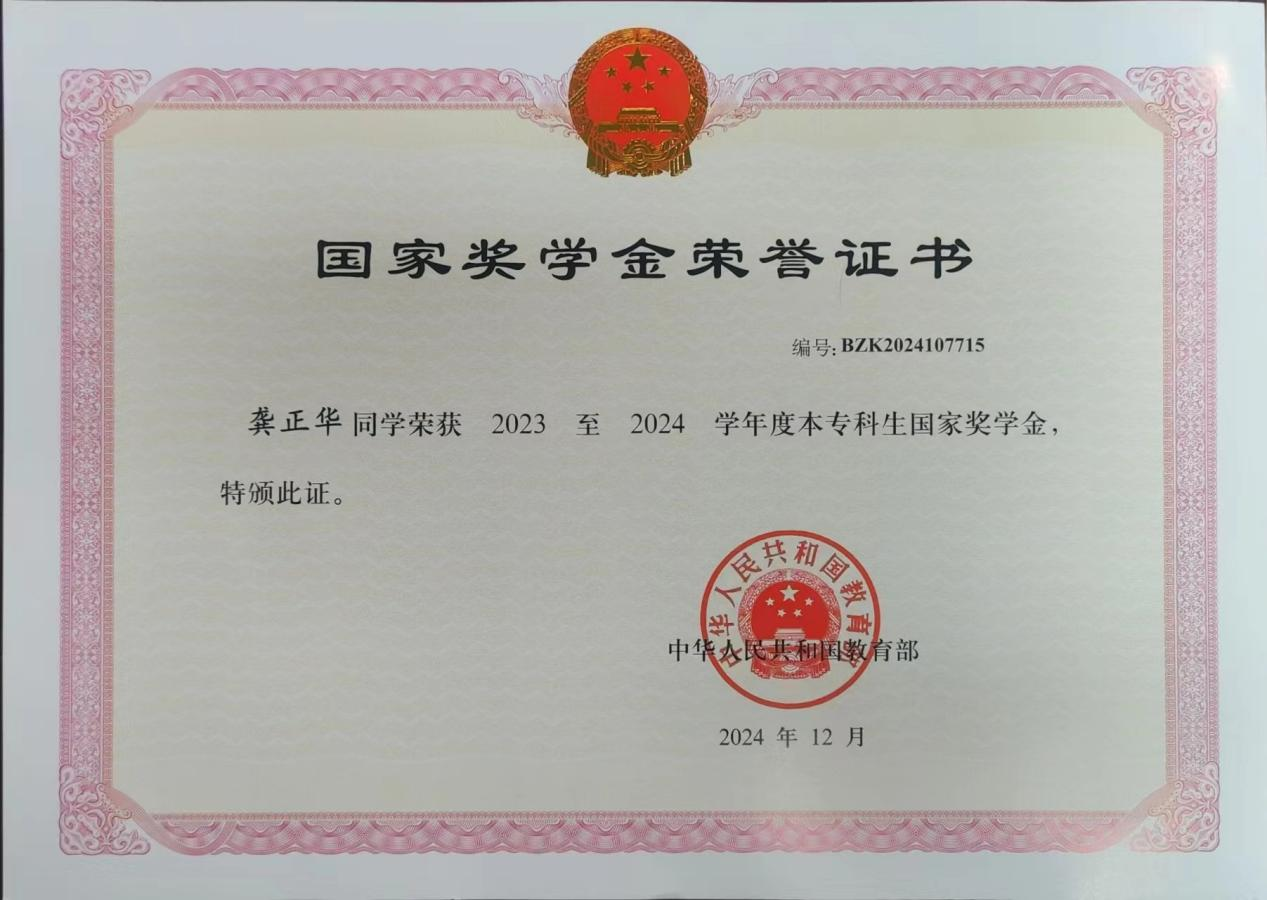 龚正华凭借卓越的学业成绩和全面发展的综合素质,在校期间,他获得过2022-2023学年度本专科生国家奖学金、2022-2023学年新旭日奖学金、2022年度全国“我来讲故事”录音作品征集展示教师组一等奖、2023-2024学年度本专科生国家奖学金、四川省2023年学生资助诚信教育公益短片优秀奖、四川省2024年首届高校心理情景剧二等奖、2025届四川省优秀毕业生等荣誉。