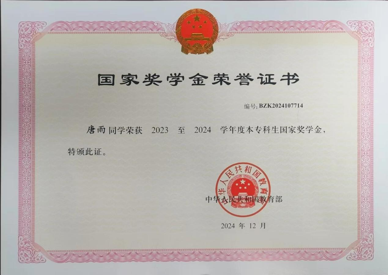 唐雨凭借卓越的综合素质和不懈的努力,成为国家奖学金获得者。在校期间,曾获得2022-2023学年度本专科生国家励志奖学金、2022-2023学年新旭日奖学金、2023-2024学年度本专科生国家奖学金、2023-2024学年获西昌民族幼儿师范高等专科学校“三号学生”“优秀学生干部”、2024年度全国“我来讲故事”录音作品征集展示教师组三等奖、“2025届四川省优秀毕业生”、校级优秀毕业生等荣誉。