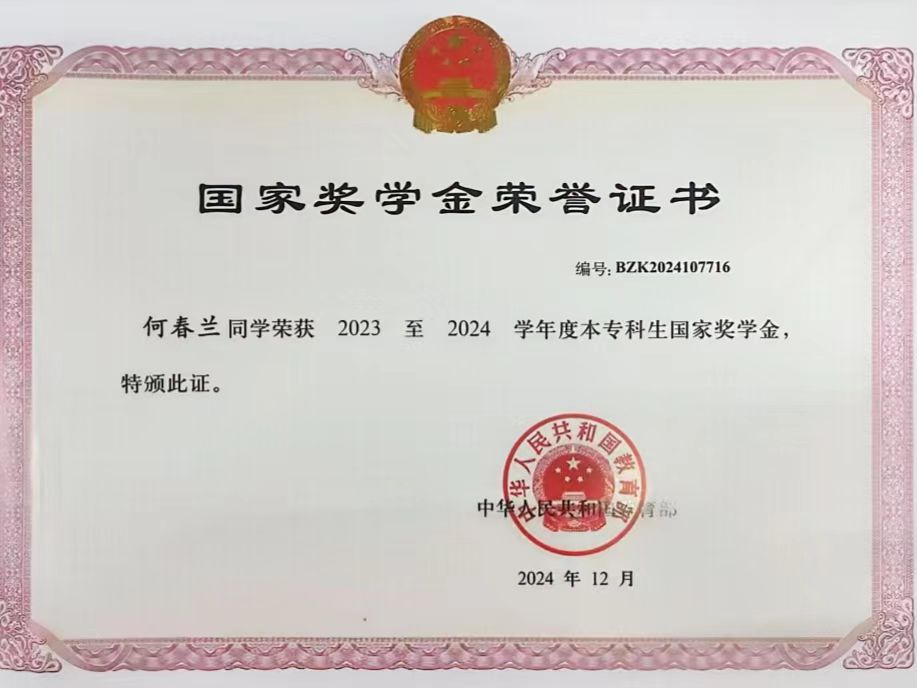 何春兰说:“国家奖学金不仅是对我过往努力的肯定,更是激励我继续前行的动力。”她表示,自己将怀揣着这份荣誉,砥砺前行。“心存希冀,是对未来无限的憧憬与追求,它如同夜空中最亮的星,指引我穿越学习的迷雾。沐光而行,则是在每一次挑战与困难面前,面向光明,勇往直前。”相信何春兰一定会在未来用行动诠释“心存希冀,沐光而行”的真谛。