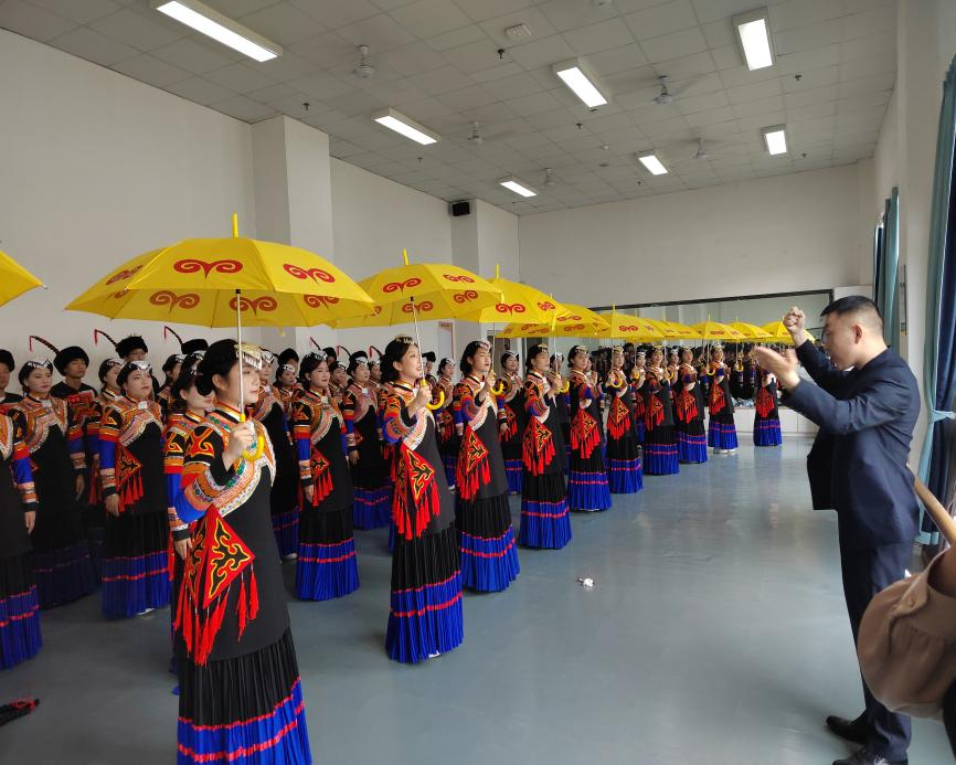 荣耀背后是师生历时一个月的倾力付出。排练期间,指导教师带领学生逐句雕琢彝语发音,反复调整伞阵变换节奏,为让动作与音乐完美契合,常常在排练厅奋战至深夜。参演学生表示:“每把油纸伞上的纹样都对应一段长征故事,排练时看着伞面流转的光影,更能体会当年红军与彝族同胞生死与共的情谊。”