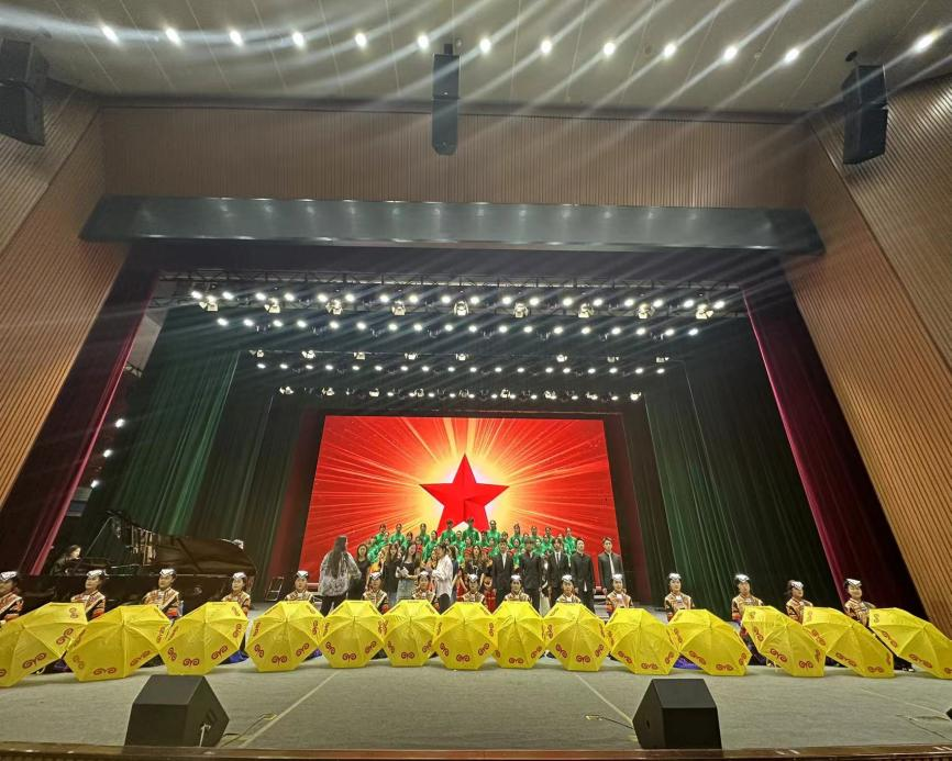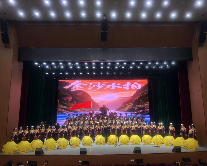 学前教育系的《玉盘》《留客歌》以创新编排引发共鸣。百名名学子身着彝族传统服饰,手持象征团结的明黄油纸伞,通过伞阵的起伏开合,再现“彝海结盟”时明月高悬、军民相拥的图景。彝汉双语合唱宛转悠扬,与背景视频中索玛花盛放的群山交相辉映;《留客歌》则通过演绎彝族群众挽留红军的动人场景,配合大屏幕上红军旗帜飘扬的画面,赢得全场热烈掌声。