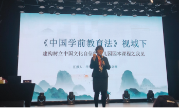 下午周念丽教授带来了《〈学前教育法〉视域下建构树立中国文化自信的幼儿园园本课程之我见》报告,周教授分析了在学前教育法视野下,中华优秀传统文化与幼儿园课程融合的重要性和意义,强调了构建文化自信园本课程可关注的内容维度以及如何进行实践。