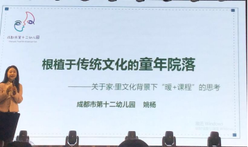 来自成都市第十二幼儿园的姚杨老师做了《根植于传统文化的“童年院落”——关于家·里文化背景下的“暖+课程”的思考》报告,十二幼结合他们幼儿园多年办学经验,提炼出幼儿园教育的核心“暖+课程”让幼儿教育成为有温度的教育,将民间游戏、中华优秀传统文化融入教学,构建出1+ N 多元课程。随后周念丽教授结合姚老师的报告,与大家共同探讨了如何在儿园课程中融入家文化。