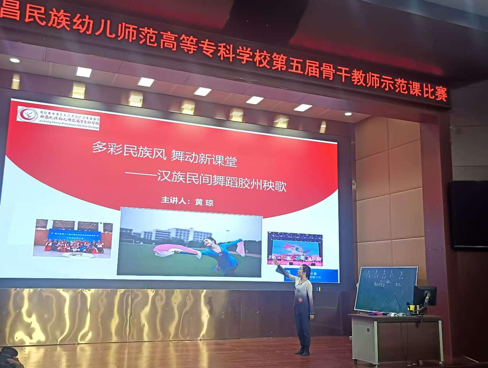 我系黄琼老师带来的《汉族民间舞蹈胶州秧歌》课程,以“多彩民族风 舞动新课堂”为主题,将传统胶州秧歌的韵律与民族特色教学相结合。课堂中,她通过动作示范、场景呈现等方式,生动呈现了胶州秧歌的艺术特点,既展现了民间舞蹈的文化魅力,也体现了幼师专业课程的实践教学特色,为骨干教师示范课比赛注入了鲜明的民族教育元素。