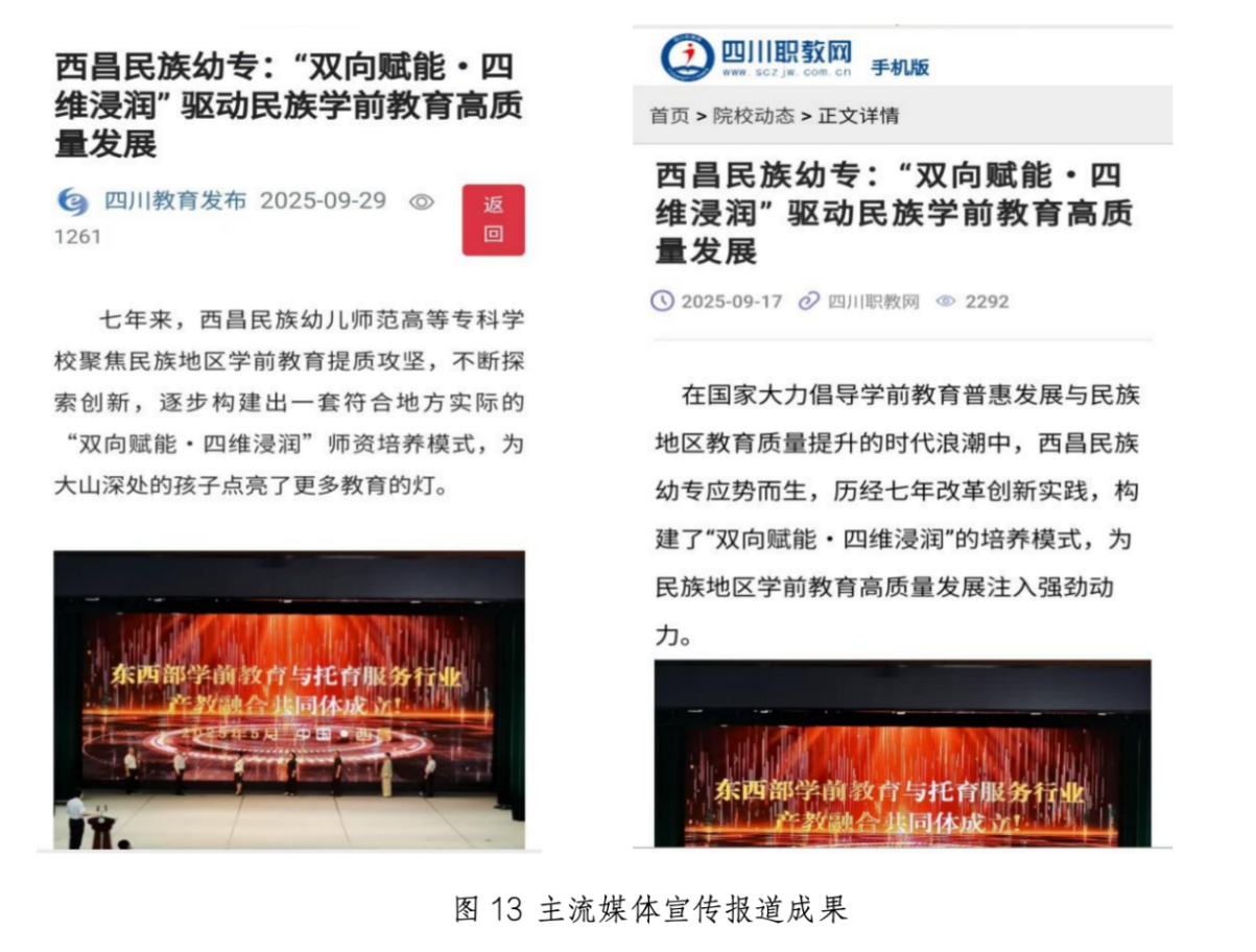 成果已在内蒙古民族幼专等6所省内外院校推广应用,12所中高职院校来校交流经验,形成“跨区域复制”效应;先后在“第77届OMEP世界学前教育组织国际学术研讨会”“中国—马来西亚教育论坛”等10余次国际、国内学术会议交流,获国内外同行高度评价;成果被人民网、《中国教育报》、“学习强国”、四川教育发布等主流媒体报道20余次;时任教育部部长陈宝生调研时评价“该模式精准解决民族地区学前教育师资难题,值得推广”;知名学前教育专家霍力岩等认为:“本成果为我国民族地区学前教育师资本土化培养提供了可复制、可推广的优质范式,对推动乡村振兴背景下基础教育均衡发展具有重要意义。”