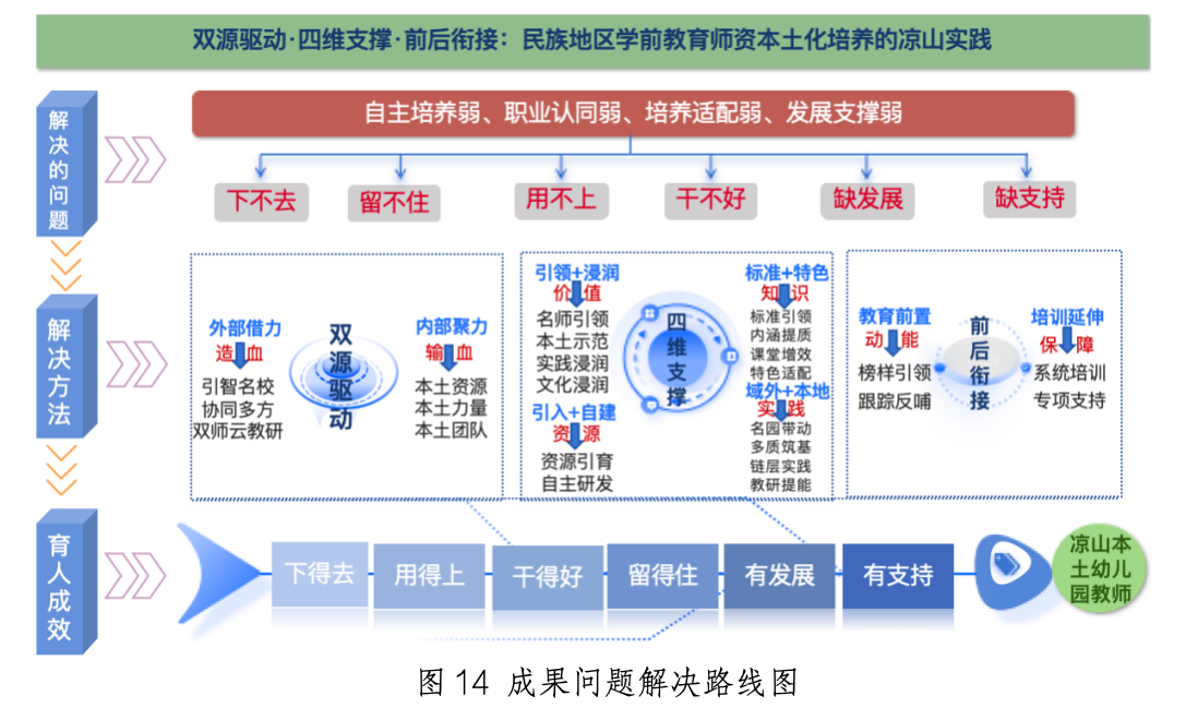 本成果以高校对口支援与教育部师范教育协同提质计划为抓手,联合四川师范大学、成都师范学院,聚焦民族地区幼教师资队伍建设的“四弱”困境和“六难”现实问题,依托国家社科基金项目、国家级职业教育教师教学创新团队等11项教学科研项目,系统构建并实践了“双源驱动・四维支撑・前后衔接”的民族地区学前教育师资本土化培养体系。该体系以“外部输血+内部造血”为双源驱动机制,重塑“价值+知识+实践+资源”的四维支撑培养体系,贯通“教育前职+培训延伸”的前后衔接路径,形成具有完整理论架构和实践方案的本土化师资培养“凉山实践”模式。