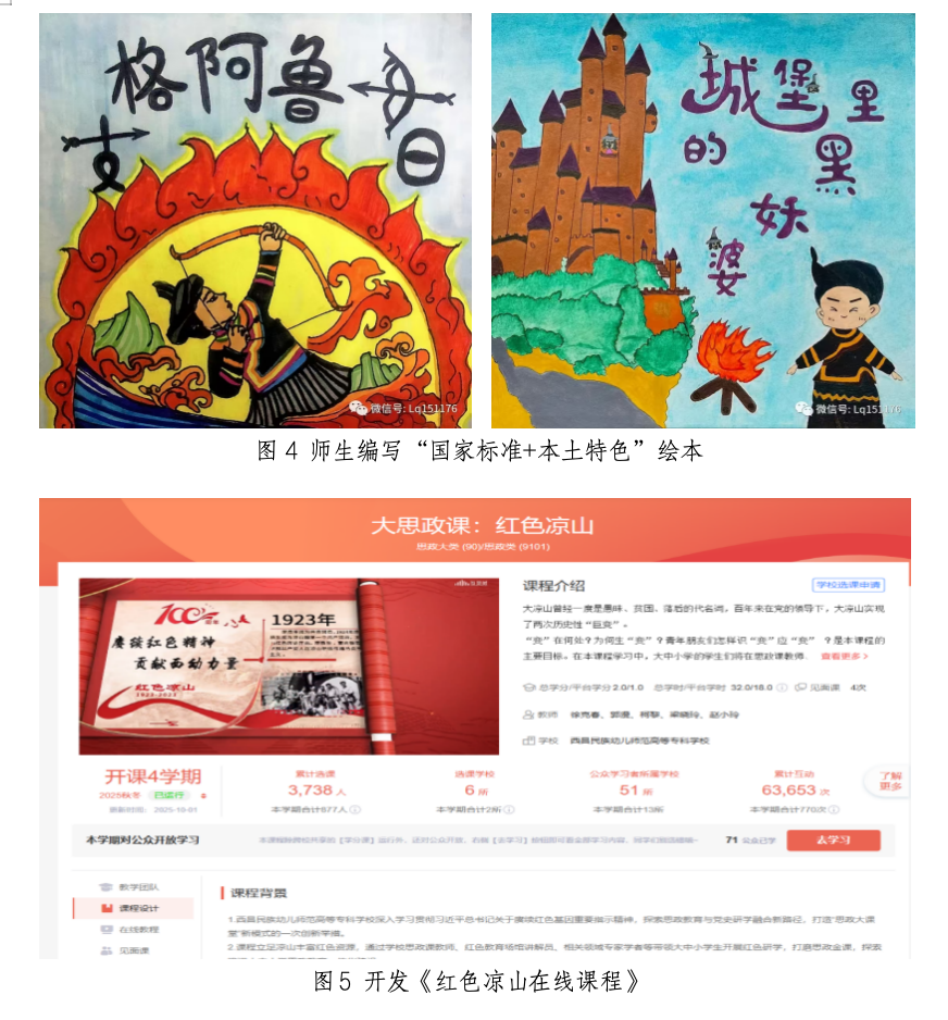 成果坚持以“双源驱动”为资源基础,通过引入外部优质资源与挖掘本土特色资源,为民族地区幼教师资培养提供支撑;通过系统搜集、提炼凉山地区一线优秀教学实践案例及优秀毕业生的典型成果,开发铸牢中华民族共同体意识儿童绘本、乡土游戏资源库等特色教学资源,并将其系统嵌入课程矩阵与教学环节。通过创设真实教育场域、整合本土资源载体、构建持续浸润机制,实现专业知识传授与价值引领的深度融合。