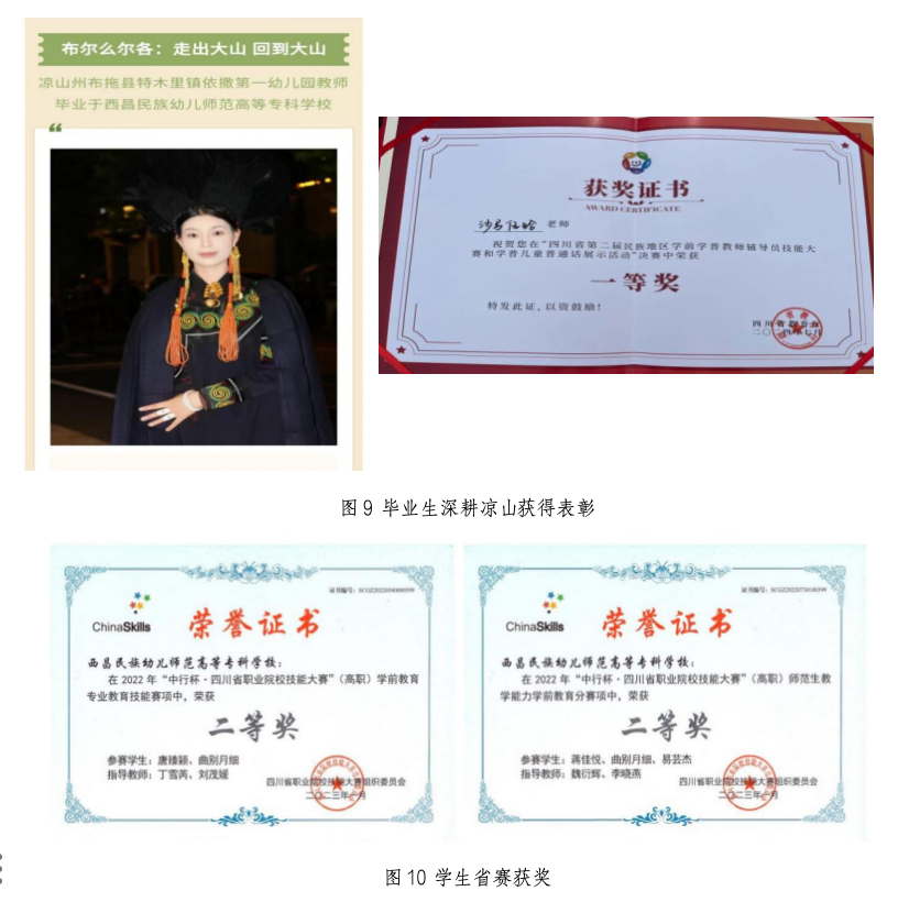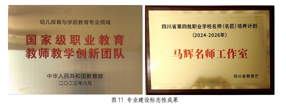 学前教育专业团队入选“国家级职业教育教师教学创新团队”,1个工作室获批“四川省职业院校学前教育名师工作室”,专业通过教育部师范类专业二级认证,成为四川省民族地区学前教育专业标杆;主持国家和省厅级项目11项,发表论文260多篇,编写国家省级规划教材14部,开发国家省级优质课程7门,5项案例入选教育部、四川省典型案例(《民族地区学前幼教师资本土化培养模式》入选 “教育部师范教育协同提质计划典型案例”)。