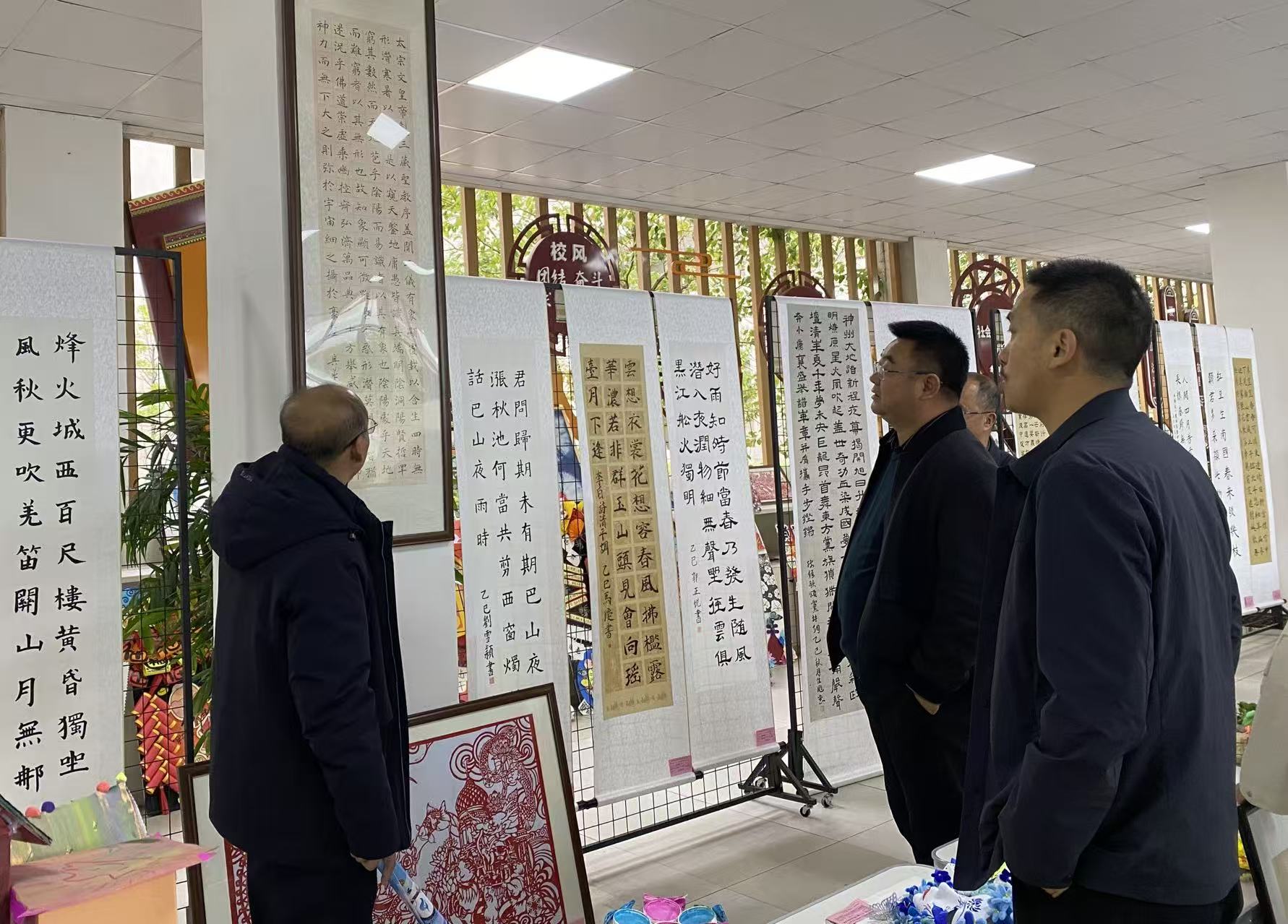 步入书画展览区,一幅幅书法作品在展架上依次展开。学前教育系主任余成红与各位领导漫步其间,他时而指尖轻点卷轴,从运笔、章法到意境进行讲解。他会在特定笔画处稍作停顿,剖析藏锋与露锋的力道与神韵;也会启发大家对比不同作品的布局与墨色,探讨鉴赏的门道。我们凝神聆听,笔尖记录着心得,我们目光流连于字里行间”全然沉浸于汉字书法精妙而深邃的美学世界。此番观摩不仅是一次审美的洗礼,更是一场关于传统文化精髓的深度对话。
