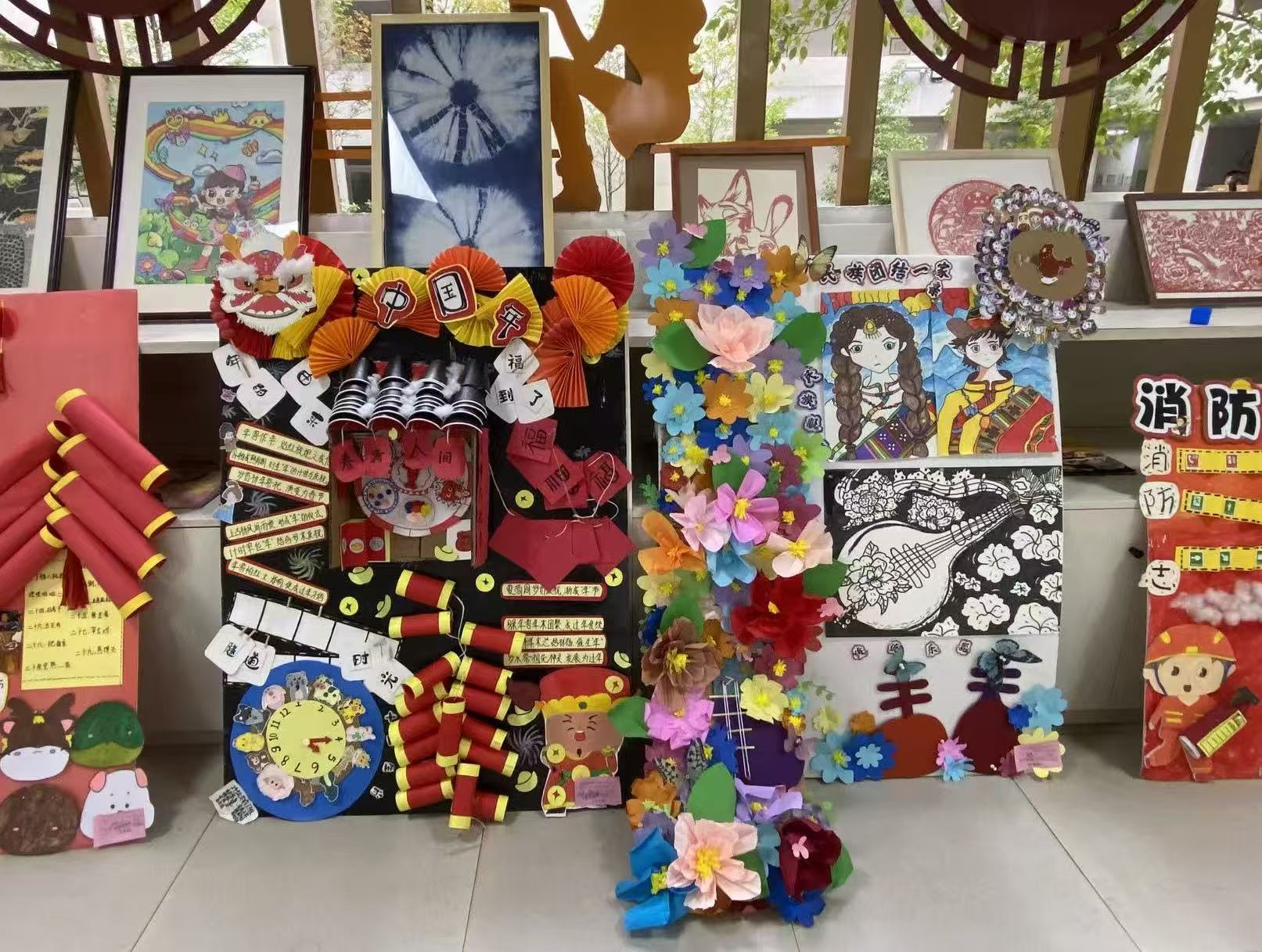 走进环创区,“中国年”的氛围扑面而来!舞狮、剪纸和鞭炮装饰活灵活现,瞬间点燃了喜庆的年味;窗棂造型与福字点缀,处处透着传统的韵味;而民族人物与乐器图案,则悄悄诉说着文化交融的故事。背景木质展架上的绘画作品错落有致,让同学们在亲身体验中,感受到了传统文化的韵味。