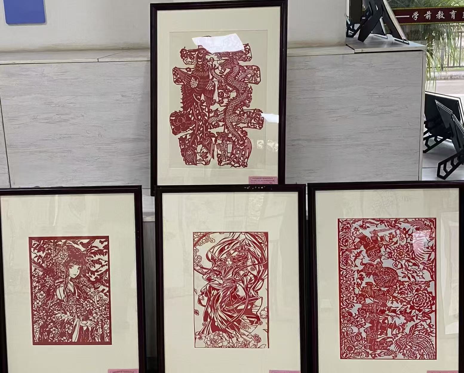走进手工作品展览区,多幅剪纸与版画作品被精心装裱在统一的黑色边框内,整齐排列。作品风格鲜明,既有红白对比强烈的传统剪纸,展现着浓郁的民族风情;也有线条细腻、构图巧妙的黑白版画,透露出现代设计感。它们错落有致地布满展墙,展现了创作者精湛的手工技艺,更营造出浓厚的艺术氛围,吸引了观者驻足品评。