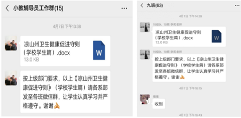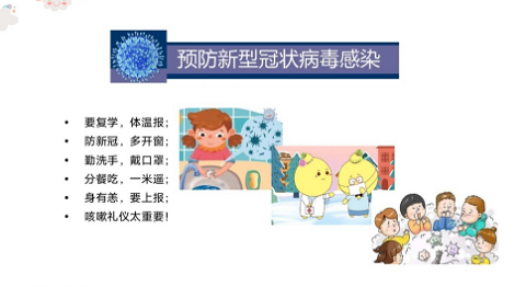 4月12日晚七时,小学教育系21个班级,在长江雨课堂在线直播平台,开展了“防疫有我,爱卫同行”主题班会,实际参与学生1112人。各班辅导员们利用本次线上主题班会,认真宣传新冠肺炎疫情防控新的要求,分析国内、国际疫情防控的新形势,积极引导学生认识“爱国是核心、卫生是根本、运动是方式”的爱国卫生运动内涵,全方位、多层次推进爱国卫生运动,做到爱国卫生知识宣传全覆盖。