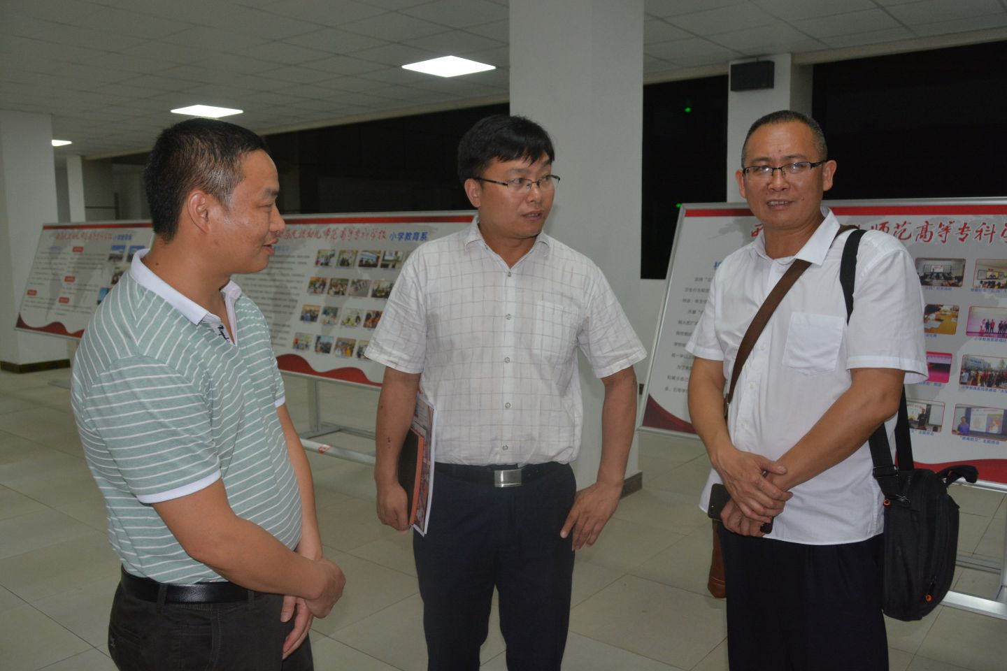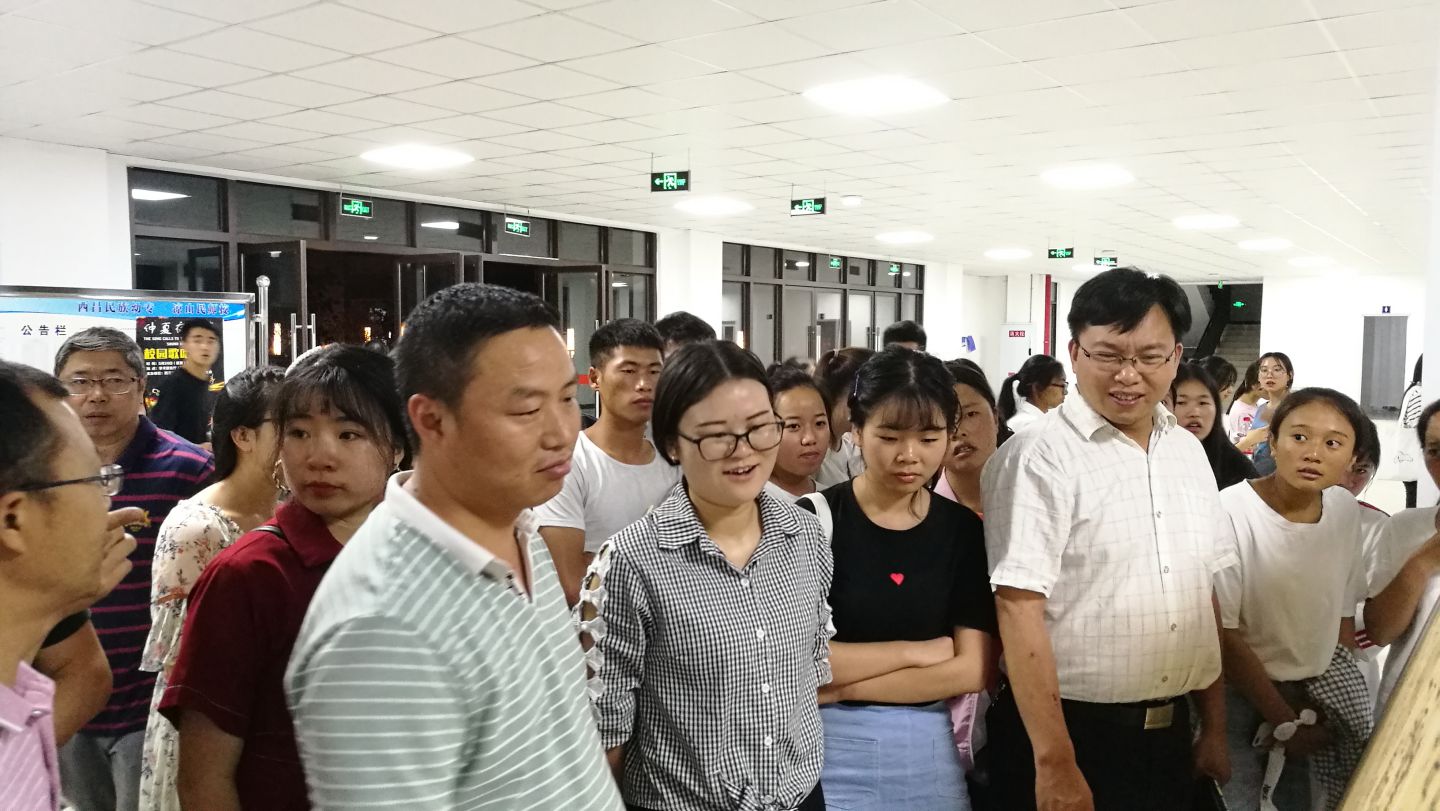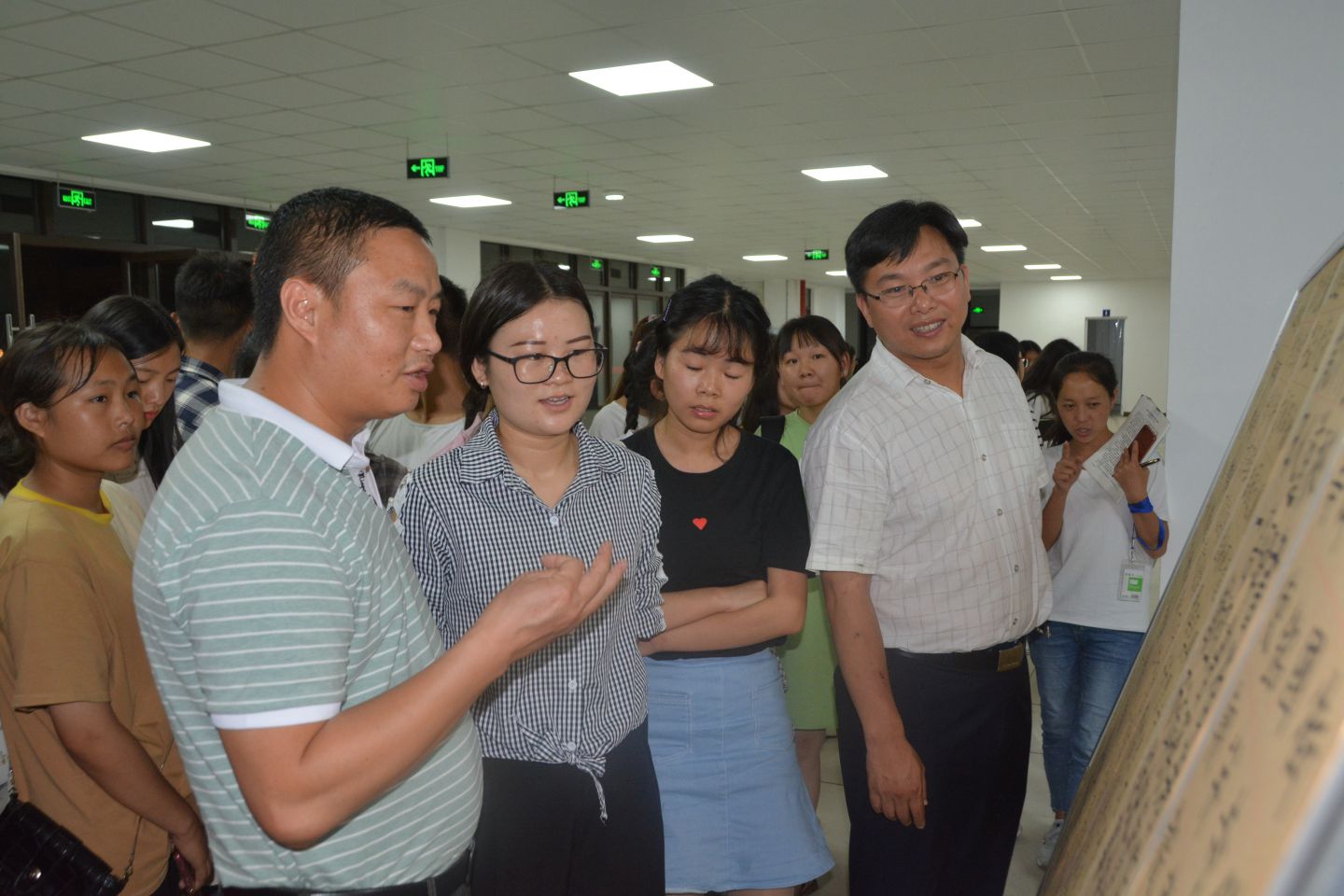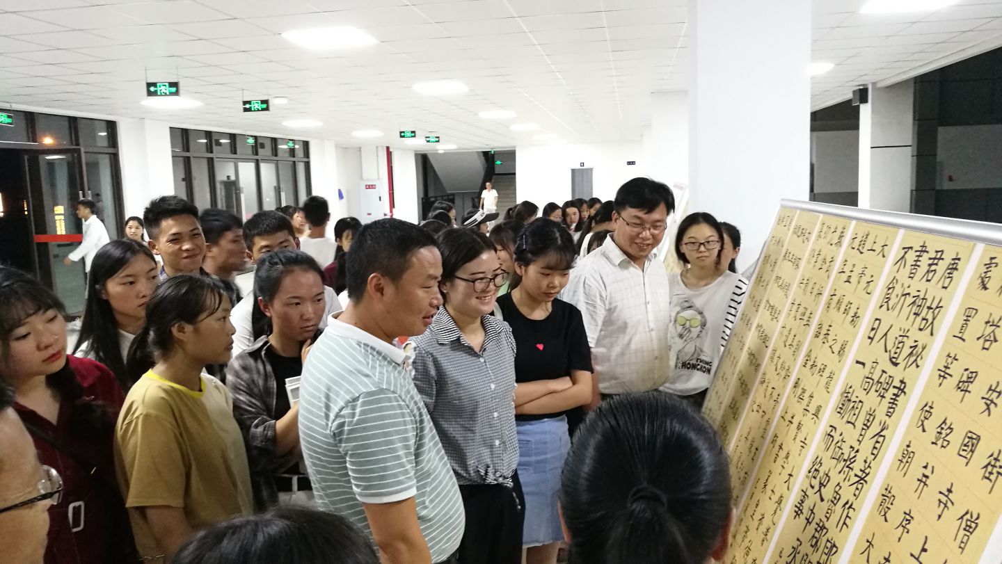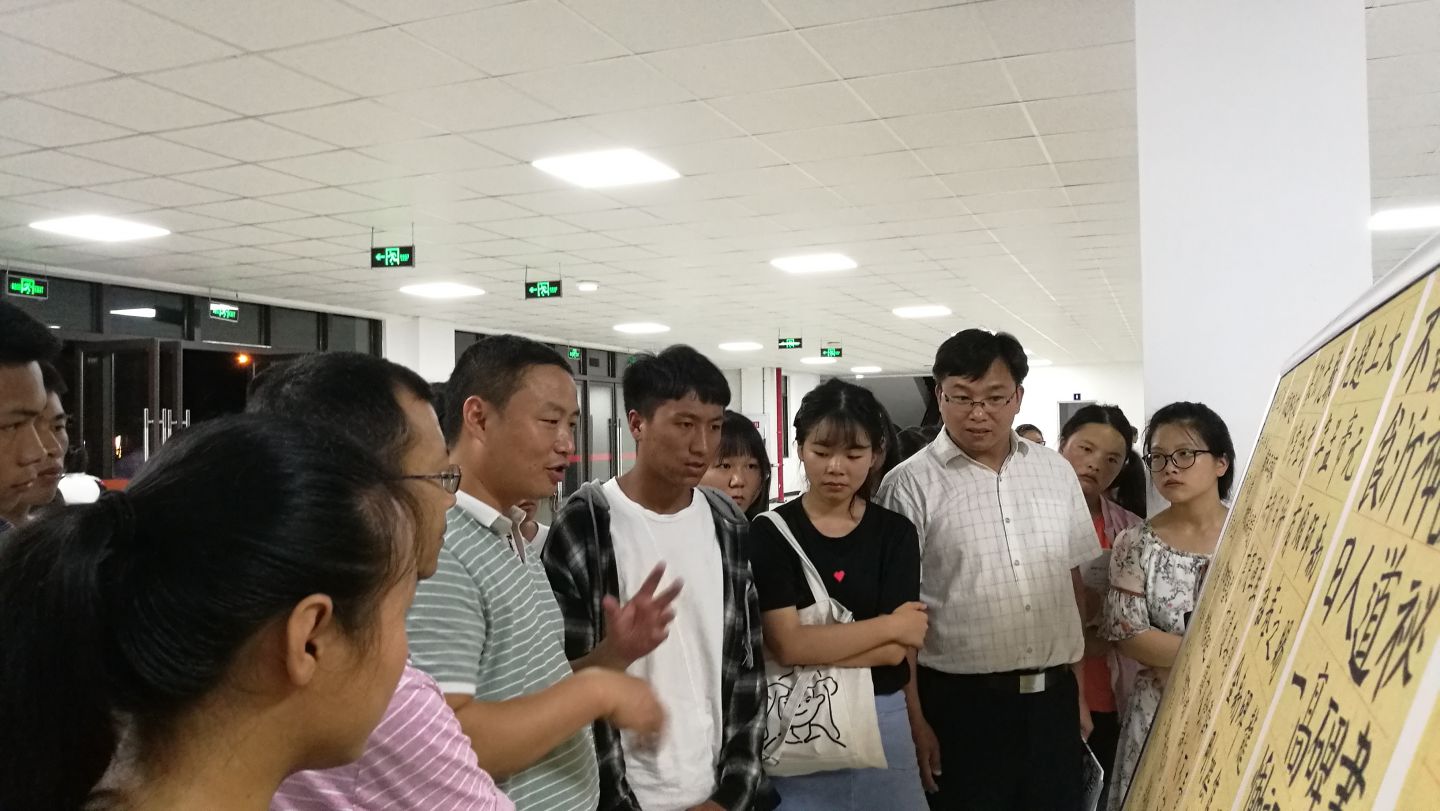 讲座结束后,覃老师在众多师生的陪同下,亲临小教系大厅,观看了同学们的书法展,并且指出了作品中的不足之处和优点。