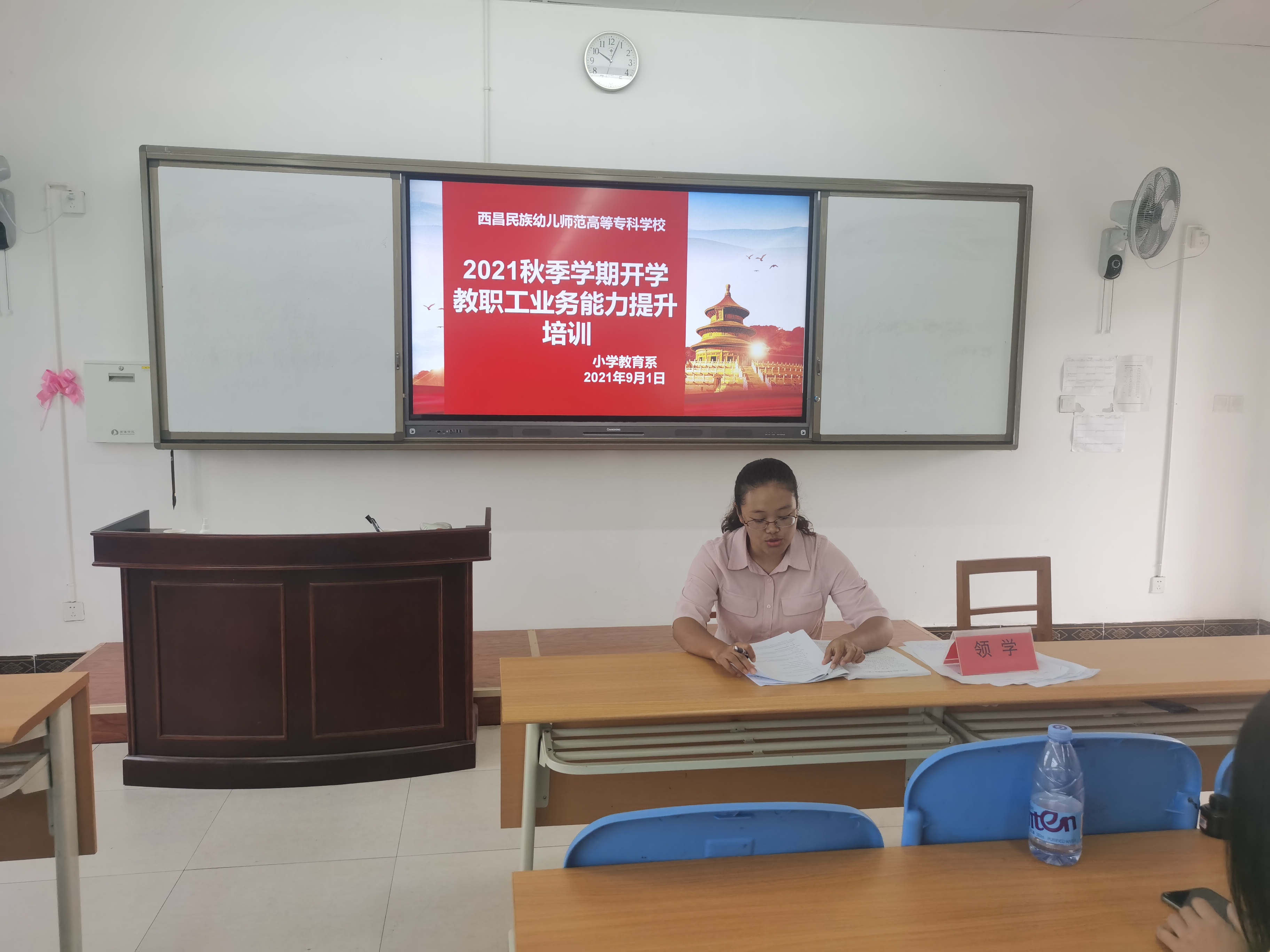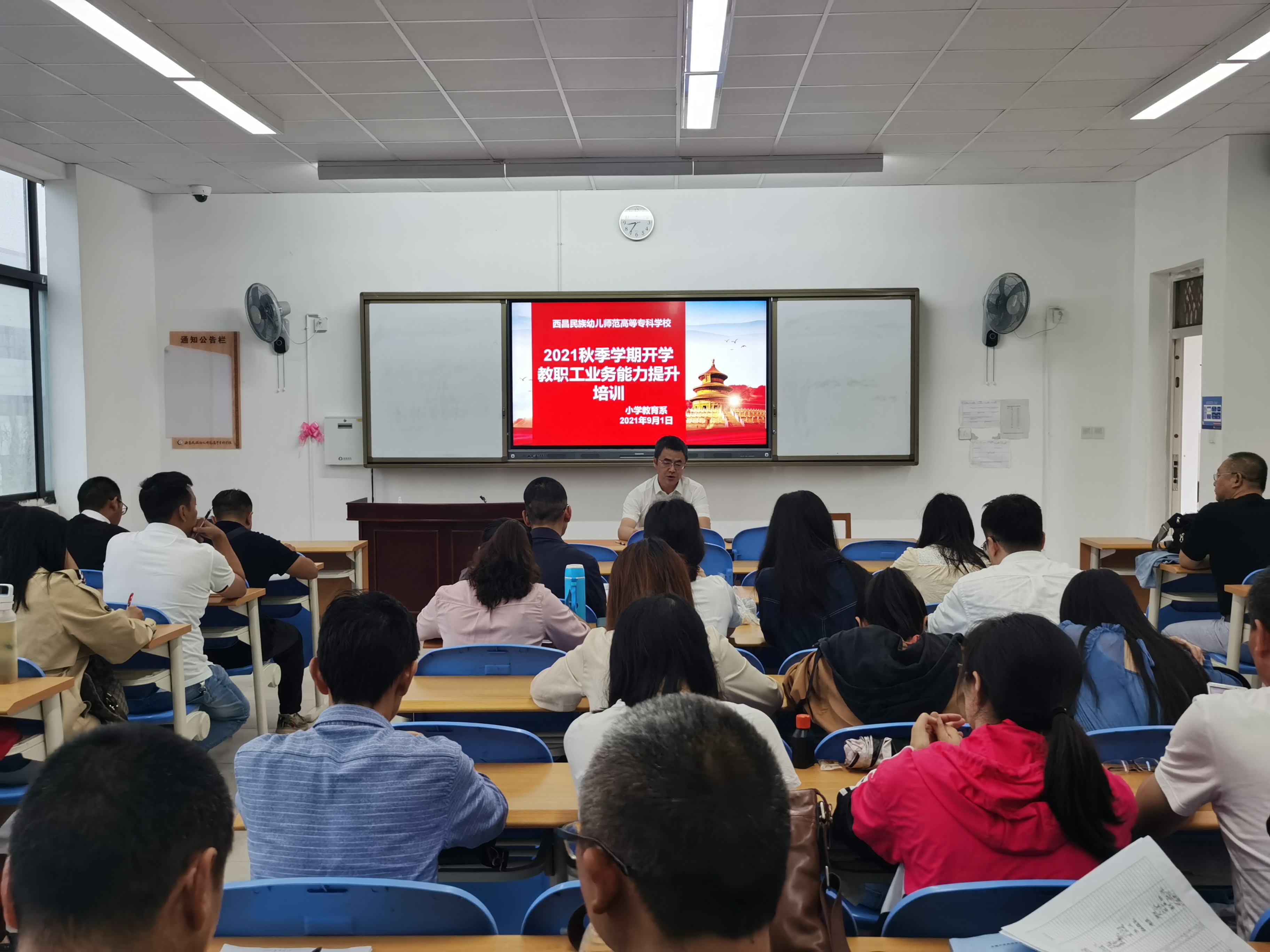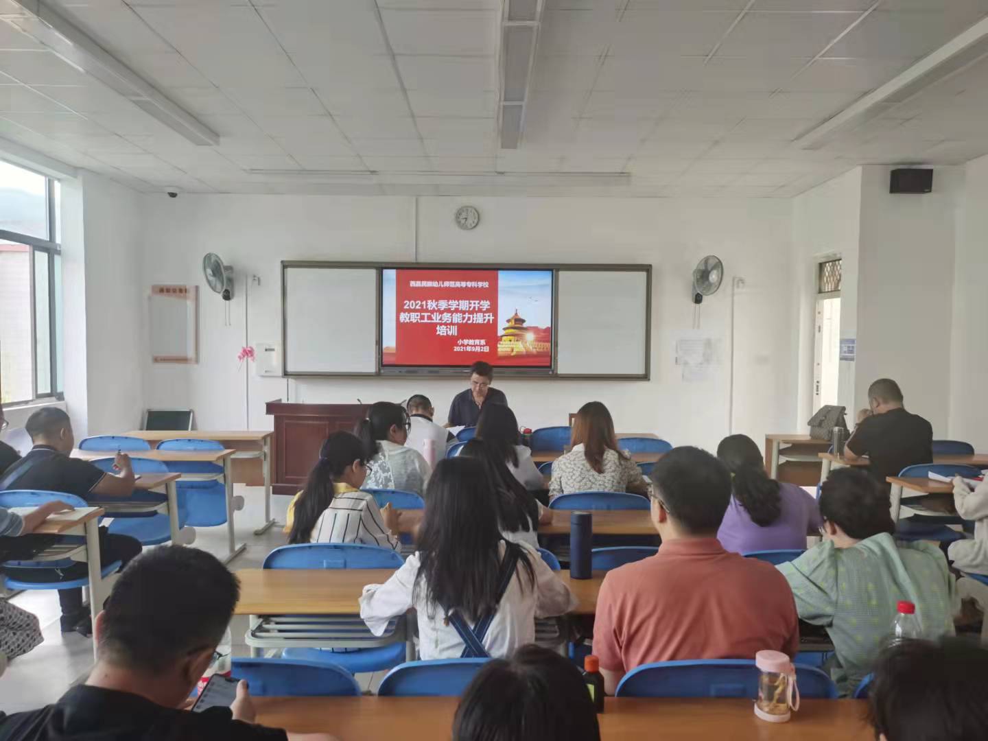 为进一步加强师德师风建设,规范教育教学工作,树立现代高等教育理念,提升全体教职对学校办学理念和文化的认同,增强爱校、爱岗、敬业的责任感、使命感,进一步推动学校规范入流、内涵发展,结合工作实际,9月1日-9月2日,小学教育系于第三教学楼3403召开了2021秋季学期开学教职工业务能力提升培训会。会议由小学教育系主任安险峰主持。小学教育系全体教职工参会。