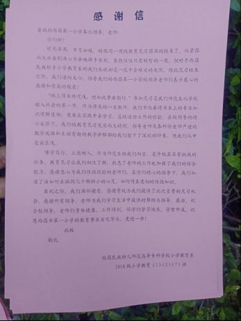 2019年4月19日下午,西昌民族幼专小学教育系为期一周的见习之旅也到此结束了,在紧张繁忙的见习过程中,学生们切实感受到了人民教师身上甜蜜的重担,在学校所学的专业技能也运用于实践,得到锻炼和提高,见习学生们的表现也得到了各校领导和老师们的肯定,受到所任班级学生们的欢迎。临别之际,小教系见习队制作了感谢信和感恩礼物赠送给见习学校,各校各班也根据实情安排了欢送会,本次见习活动圆满完成。