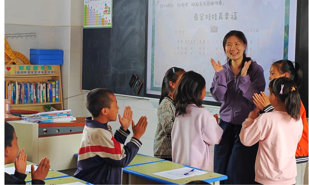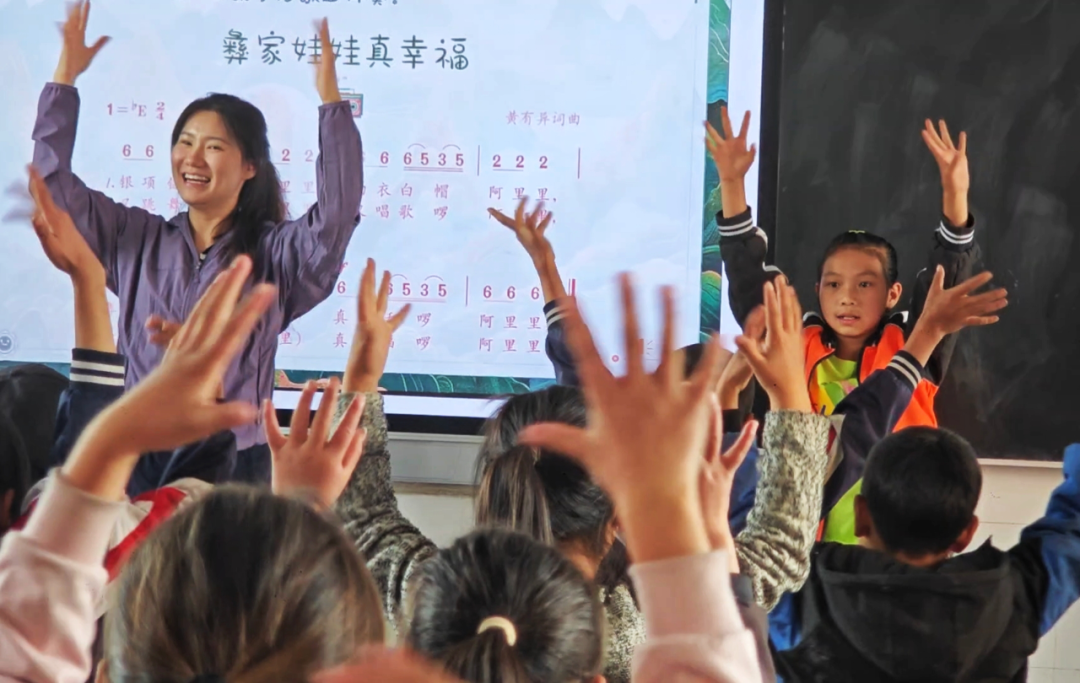 在双师教研活动中,西幼师生共同观摩了两场精彩的教学展示,一是李子小学教师呈现的“一师多科”包班制课堂教学活动,小学教育系学生直观感知乡村全科教学模式;二是西幼带队教师向秋语带来三年级音乐示范课《彝家娃娃真幸福》。向秋语老师运用自然律动的方式带小学生体验音乐魅力,通过提问激趣、律动动作创编,巧妙将乡村小学的地域特色与环境优势融入教学设计,为西幼学子生动示范如何因地制宜开展教学实践。
